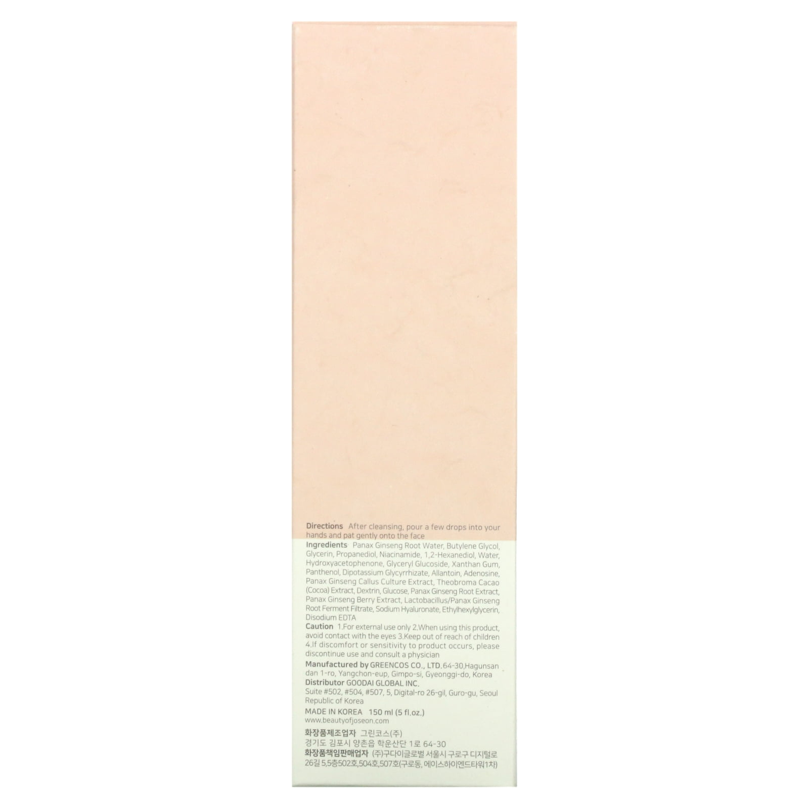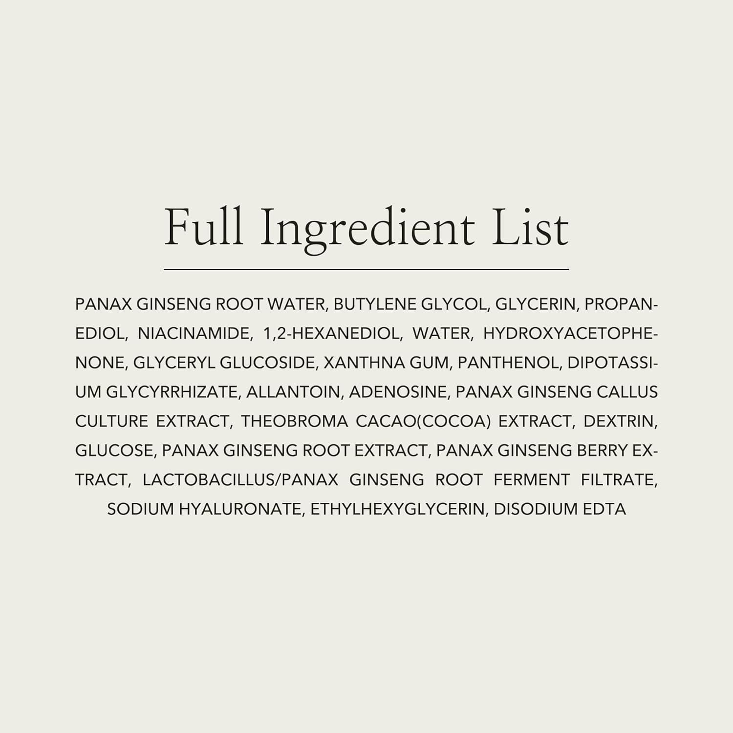 Panax Ginseng Root Water 80% Niacinamide 2% Adenosine 0.04% This is a vegan essence that contains 80% Ginseng Root Water, 2% Niacinamide and additional Ginseng Complex. It helps keep skin hydrated and nourish.
