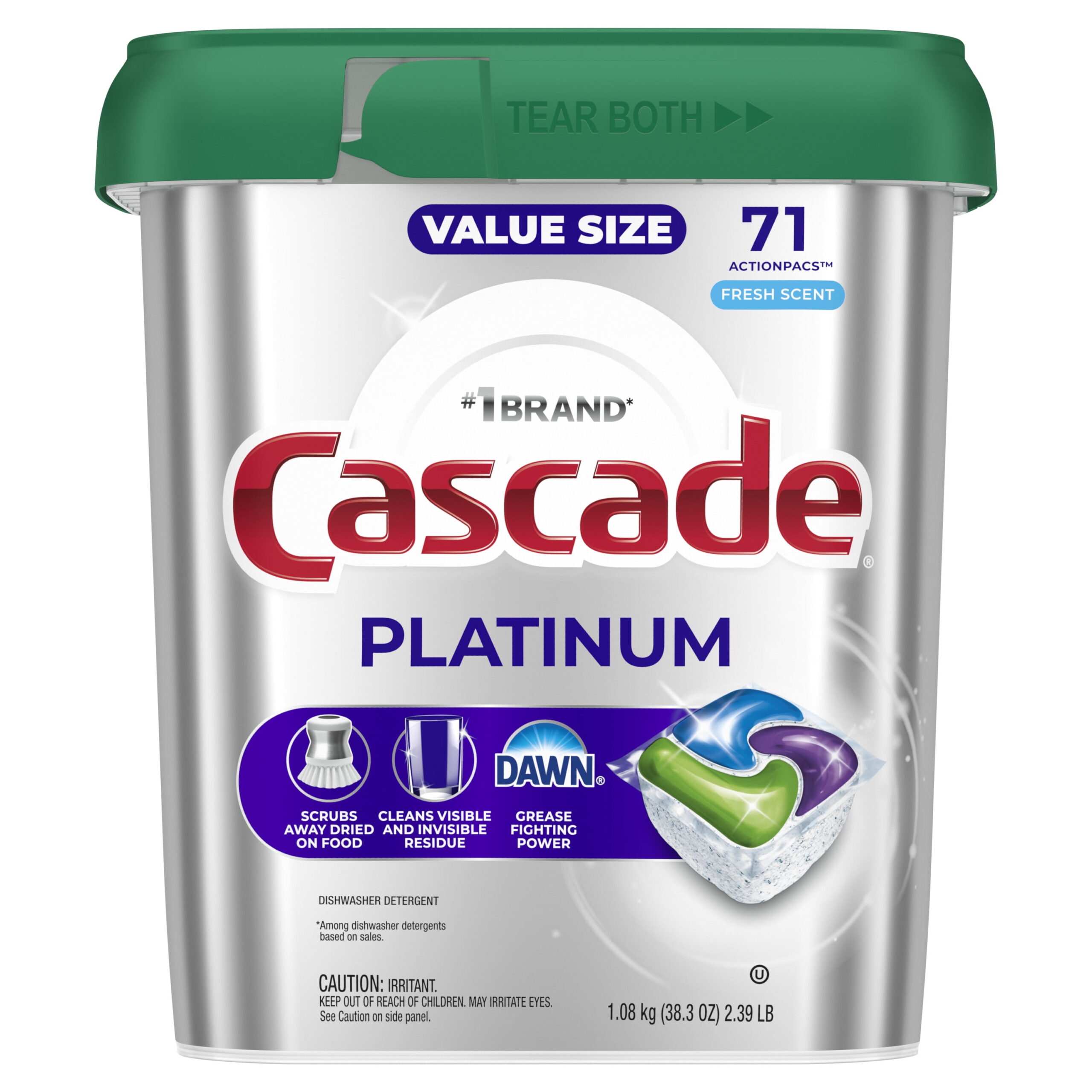 New and Improved Cascade Platinum ActionPacs dishwasher detergent pods scrubs away dried-on food with no pre-washing required. That’s because these dishwasher detergent pods dissolve fast to start cleaning right away, releasing the soaking power of Dawn dishwashing liquid, while food-seeking enzymes latch on and break down food into particles so small they can flow right down the drain. Cascade Platinum dishwasher detergent pods are formulated to remove visible and invisible residue for gleaming glassware and dazzling dishes. With these powerful dishwasher detergent pods, you can save up to 20 gallons of water per dishwasher load when you skip the pre-wash and run your dishwasher with Cascade Platinum dishwasher detergent. Experience the difference with these effective dishwasher detergent pods that ensure your dishes come out sparkling clean every time! Platinum, Fresh, 71 Count