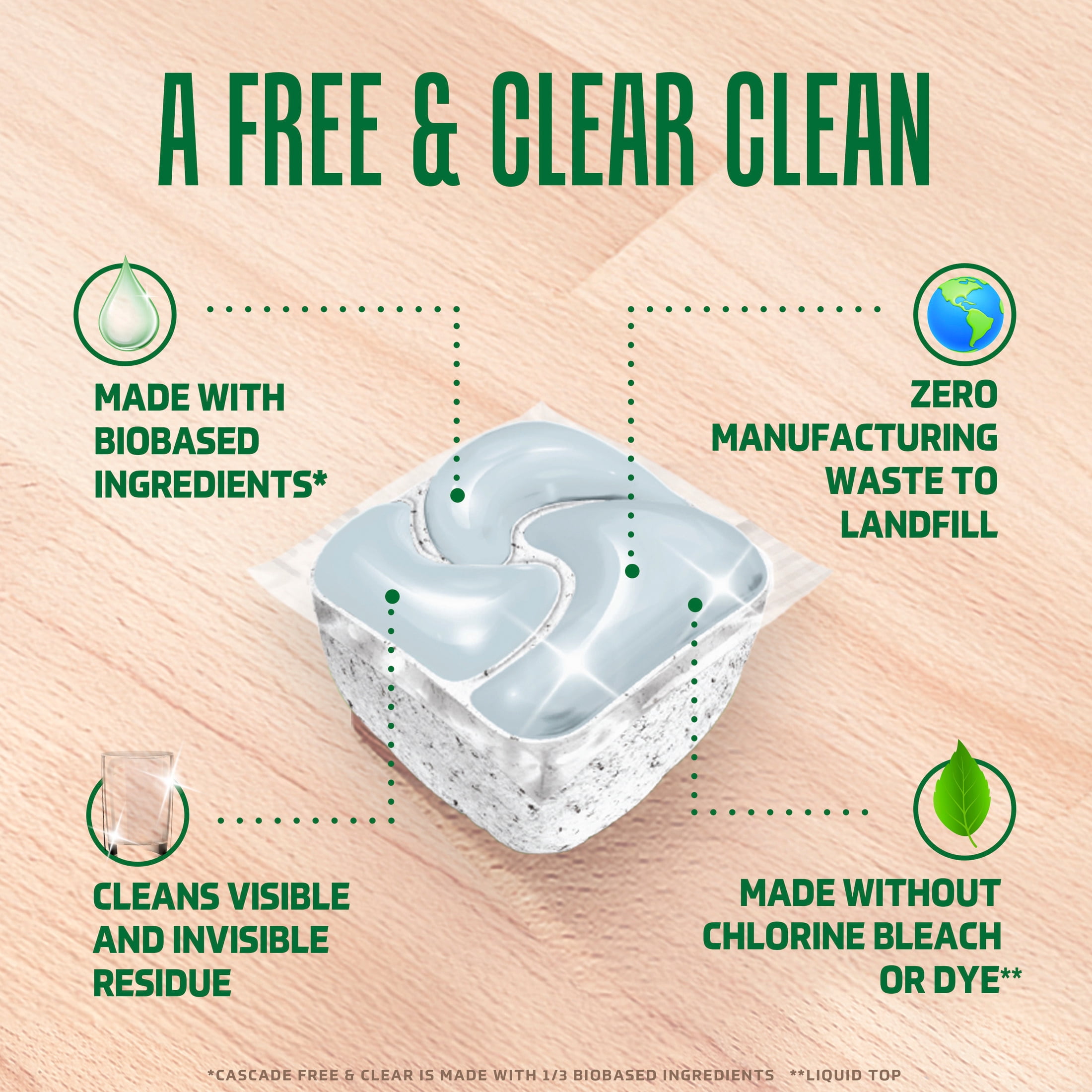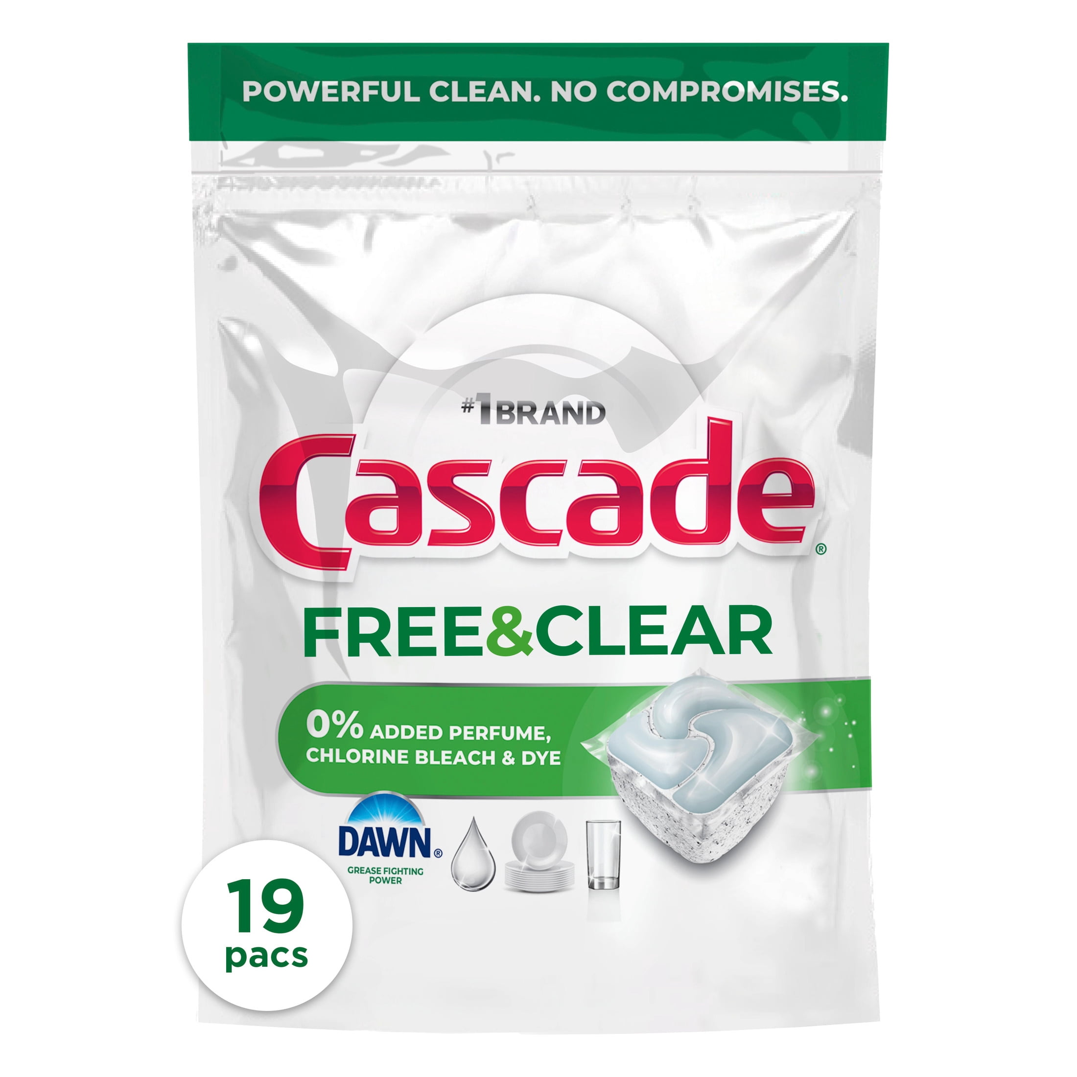 FREE FROM: Cascade Free & Clear has a dye-free liquid top contains no chlorine bleach, phosphates, or added perfume while still delivering the clean you expect from Cascade dishwasher pods.