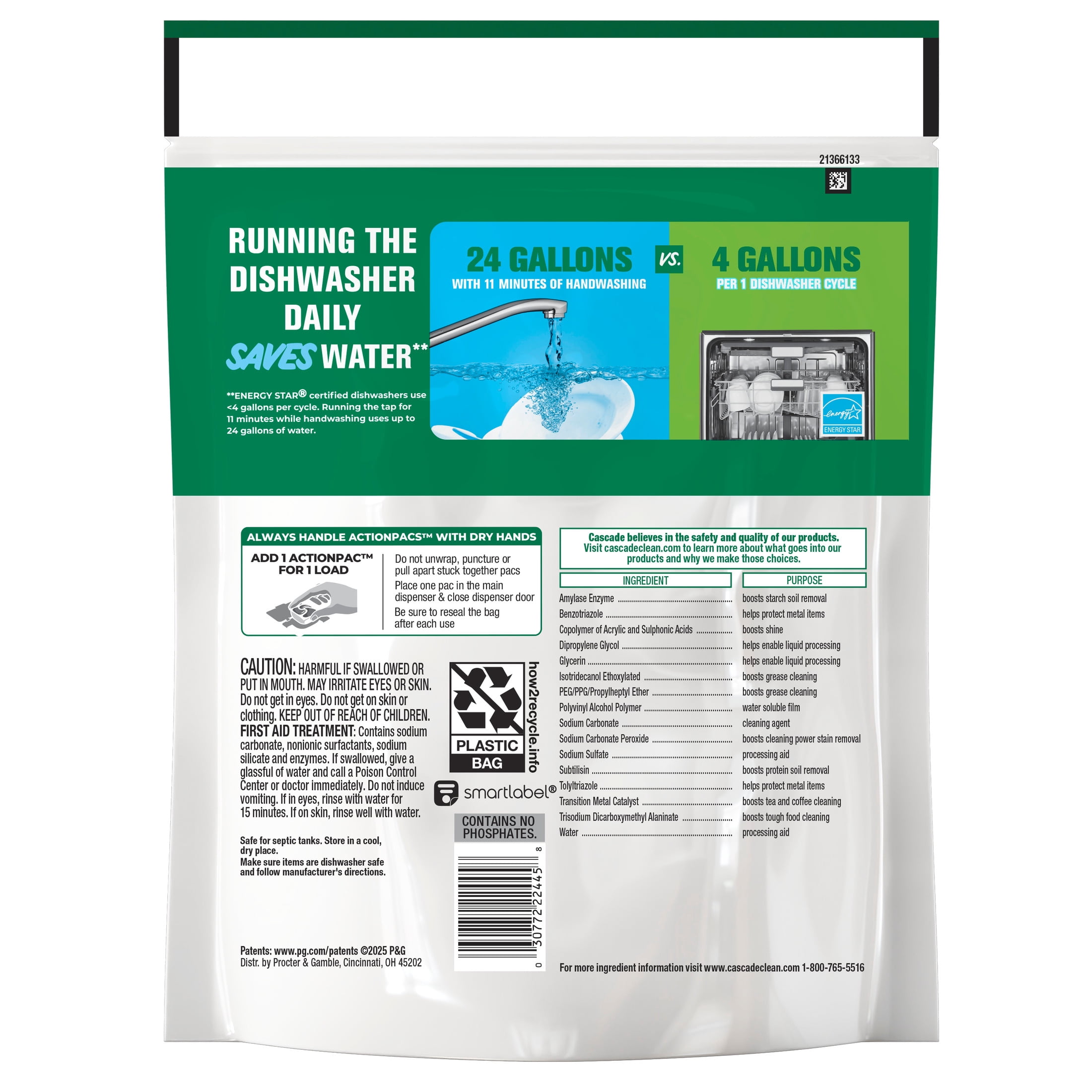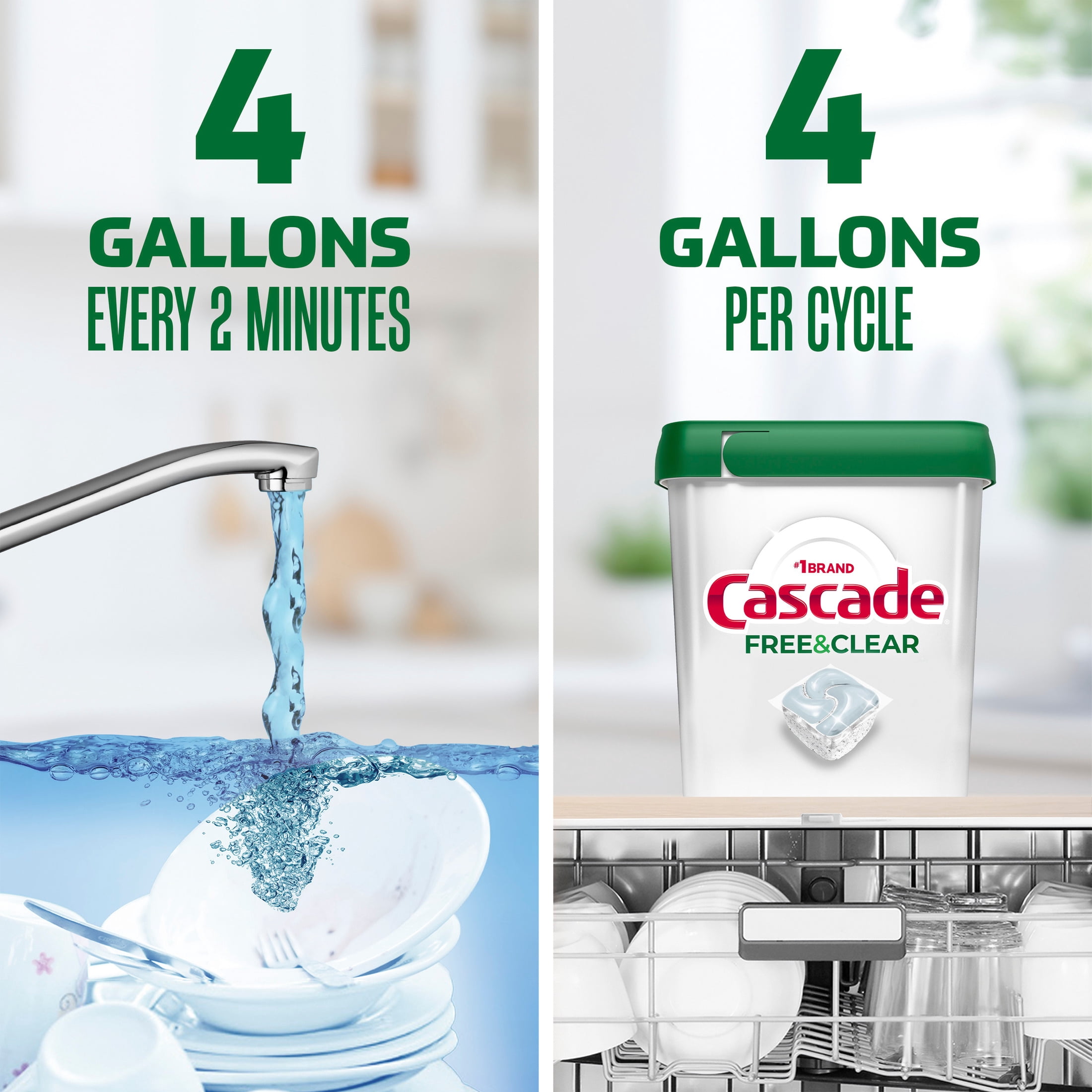 Who says you have to compromise on clean? Cascade Free & Clear dishwasher ActionPacs have a dye-free liquid top that is free from chlorine bleach, phosphates, and added perfume. Our dishwasher tabs scrub away dried-on food, no pre-washing required, giving you the clean you expect from Cascade. We are the only dishwashing pod that is formulated with the grease fighting power of Dawn dish detergent, giving you sparkling clean dishes that don’t need to be rewashed. This dishwasher detergent cleans visible and invisible residue and powers away 24 hour stuck-on food and messes leaving you with nothing but sparkling clean dishes. Our single dose dish pods are conveniently wrapped in a dissolvable PVA film that can be tossed right into the dishwasher without needing to unwrap or measure. Cascade is also the only dishwashing detergent pods that are ROTO-ROOTER Approved Safe for Pipes! Cascade Free & Clear: Powerful Clean. No Compromises.
