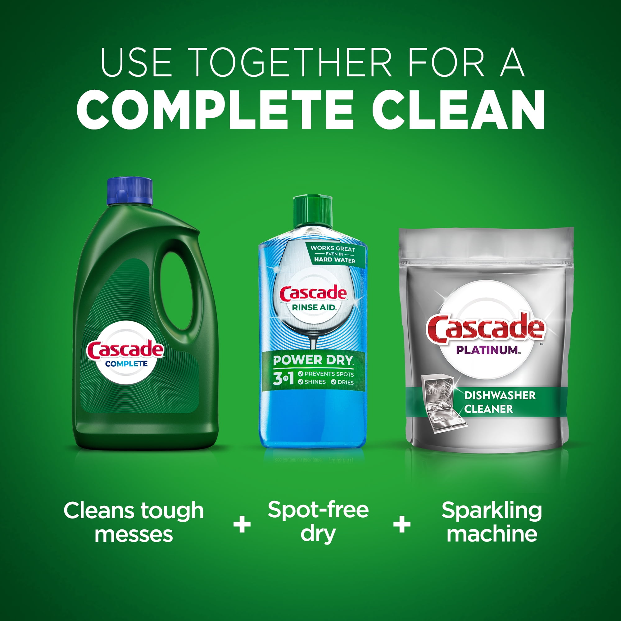 Use with Cascade Power Dry Rinse Aid and Cascade Dishwasher Cleaner for our best clean