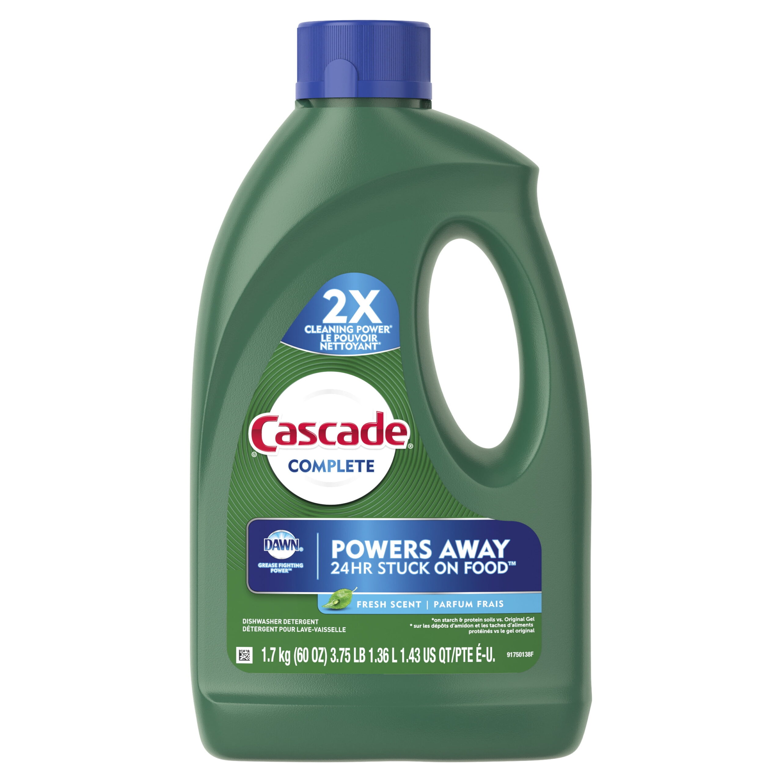 Cascade Complete Gel has 2X the Cleaning Power* and is formulated with the grease-fighting power of Dawn *on starch & protein soils vs. Cascade Original Gel