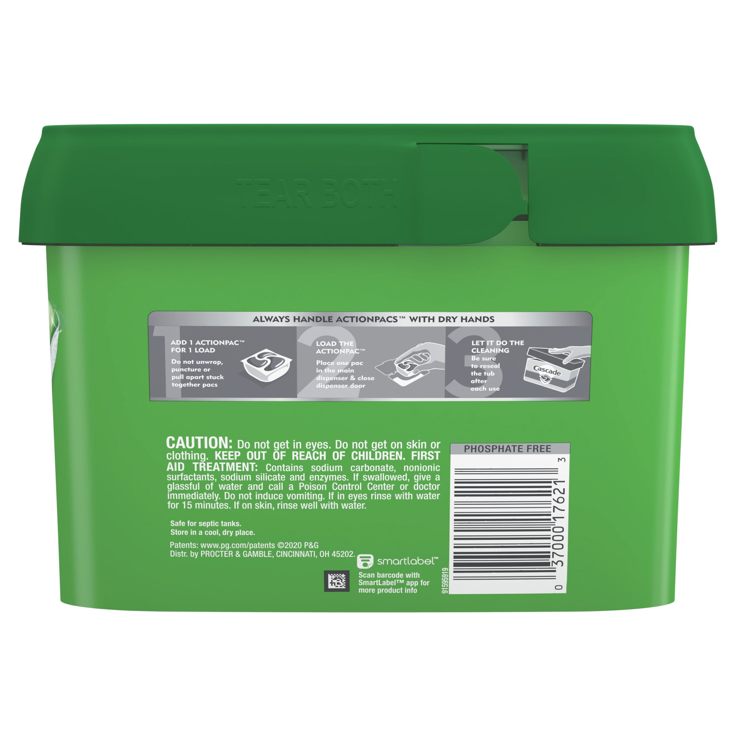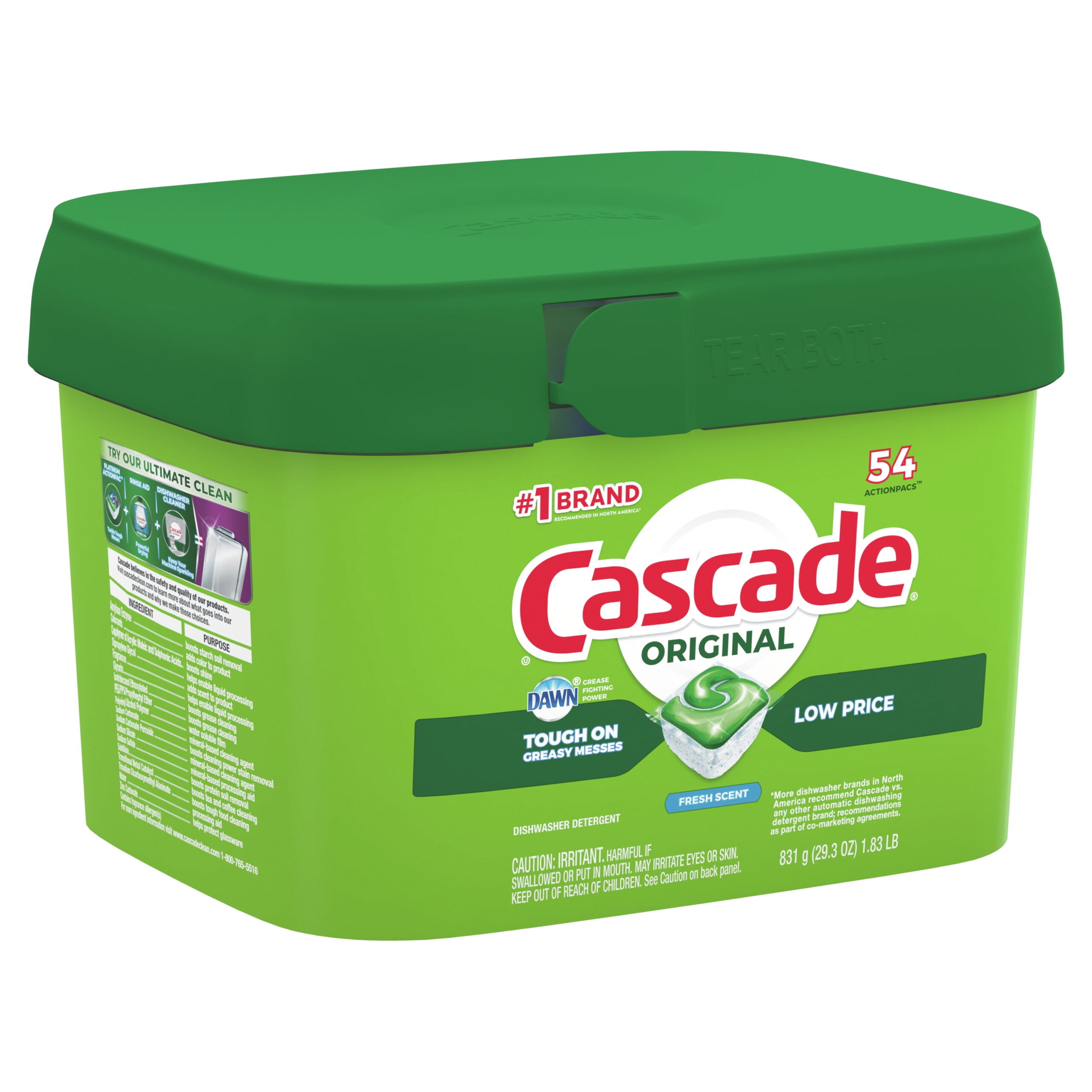 Cascade Original ActionPacs dishwasher detergent powers away greasy residue for sparkling dishes. That’s because every ActionPac combines the scrubbing power of Cascade and the grease-fighting power of Dawn dishwashing liquid to leave your dishes virtually spotless. Cascade Original ActionPacs are conveniently premeasured with no finicky wrapping-simply load your dishwasher, pop in an ActionPac, and go! Cascade Original ActionPacs are phosphate free. Plus, Cascade Original ActionPacs dissolve quickly to unleash cleaning power early in the dishwasher cycle. For best results, use Cascade Original ActionPacs with Cascade Power Dry Rinse Aid for powerful drying and Cascade Dishwasher Cleaner to keep your dishwasher machine sparkling. Save up to 15 gallons of water per dishwasher load when you skip the pre-wash and run your dishwasher with Cascade Original ActionPacs. Cascade is the #1 Recommended Brand in North America* *More dishwasher brands in North America recommend Cascade vs. any other automatic dishwashing detergent brand, recommendations as part of co-marketing agreements. Fresh Scent, 25 Packs
