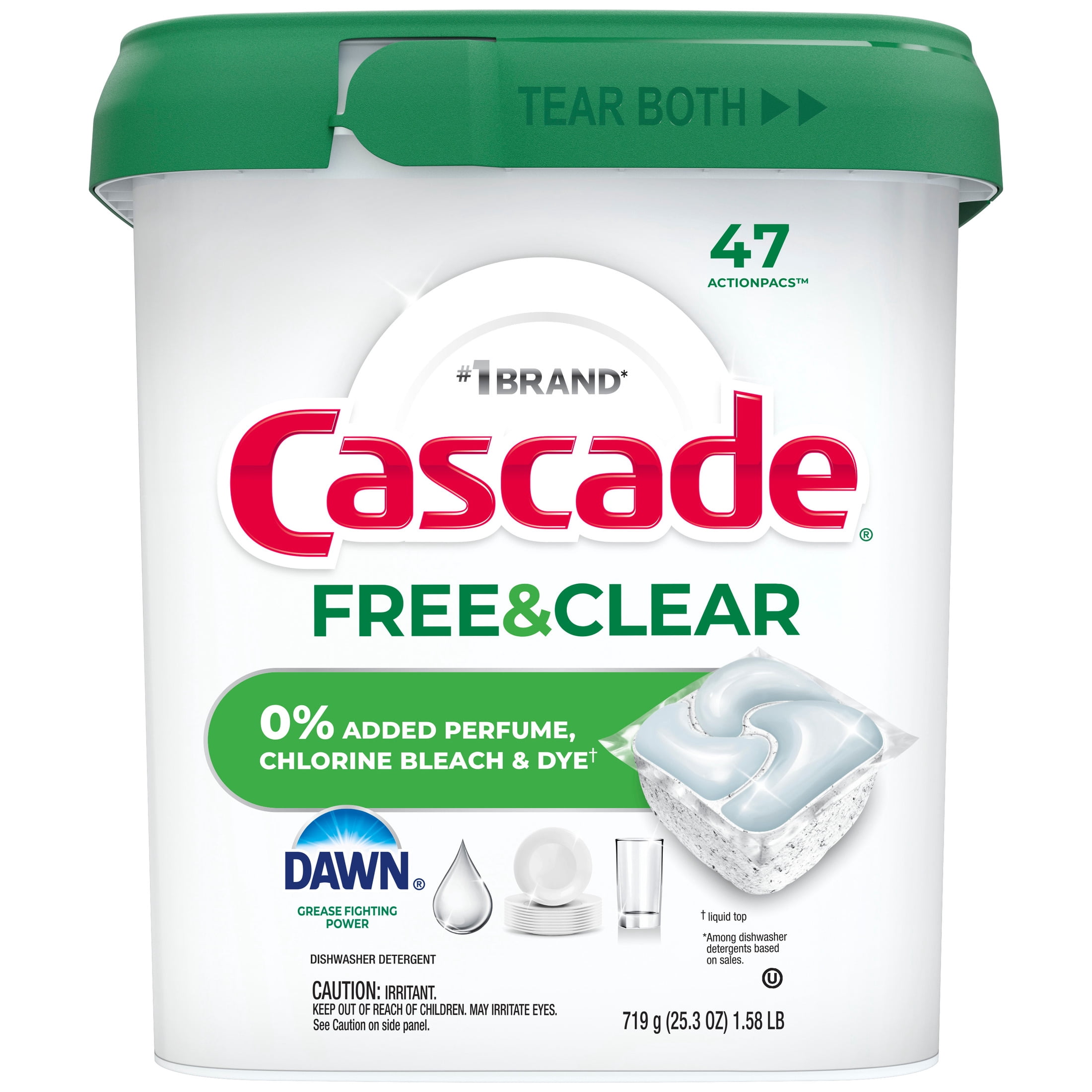 FREE FROM: Cascade Free & Clear has a dye-free liquid top contains no chlorine bleach, phosphates, or added perfume while still delivering the clean you expect from Cascade dishwasher pods.