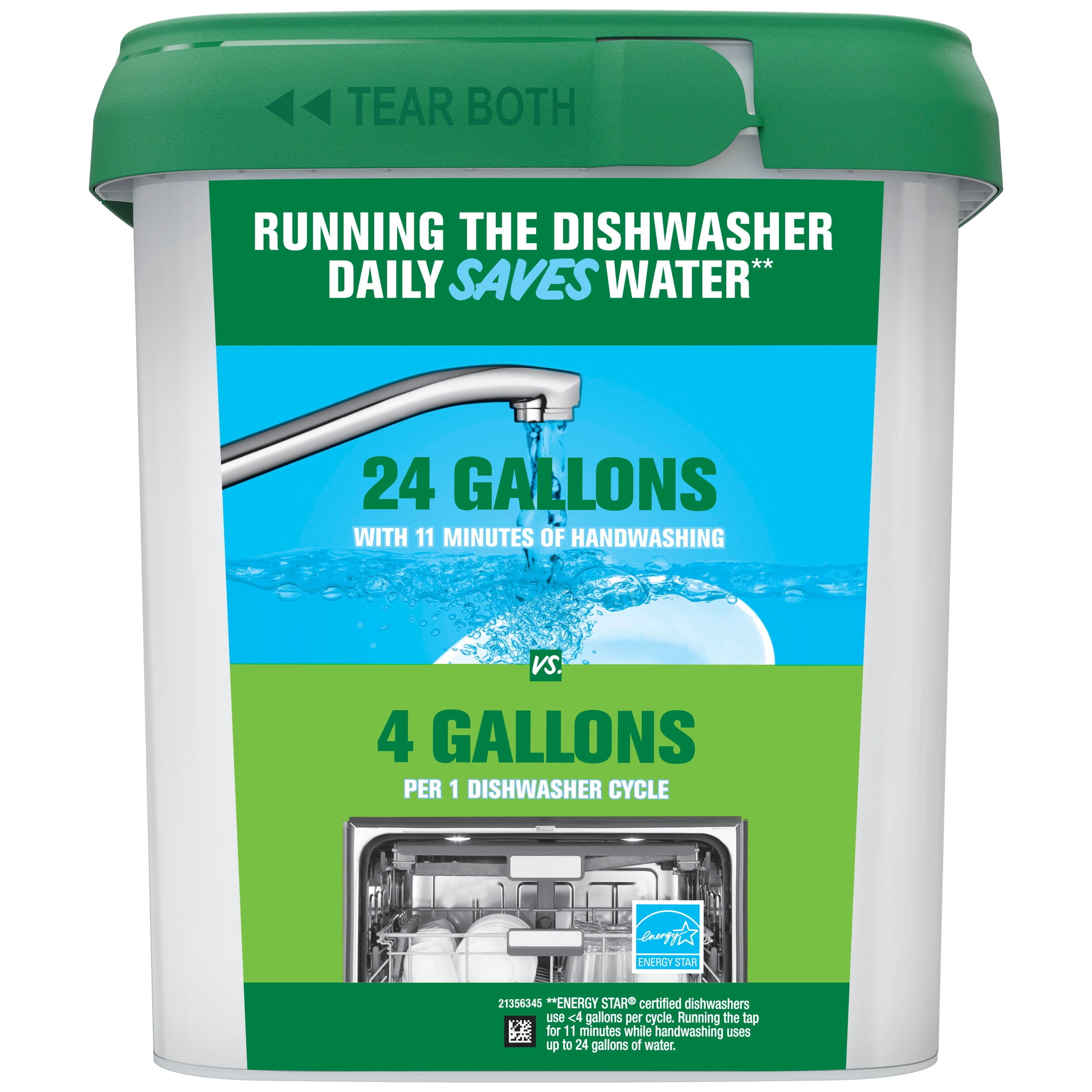 DISHWASHERS SAVE WATER*: *ENERGY STAR certified dishwashers use 4 gallons per cycle. Running the tap for 11 minutes handwashing uses up to 24 gallons of water. Run your dishwasher, use 80% less water.