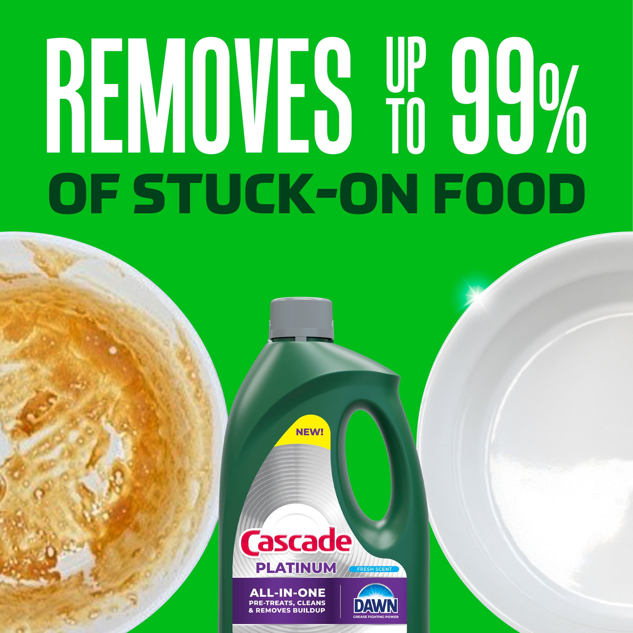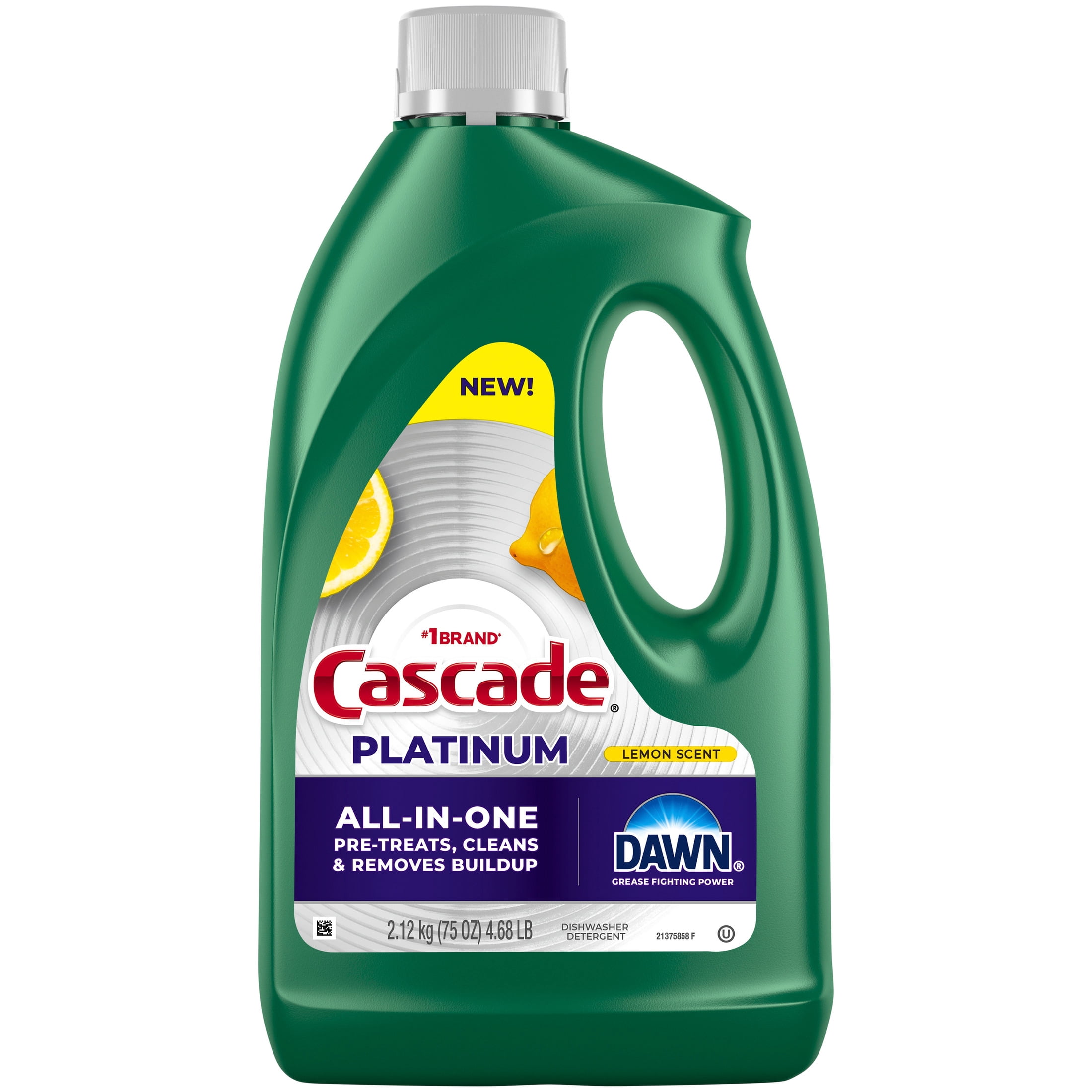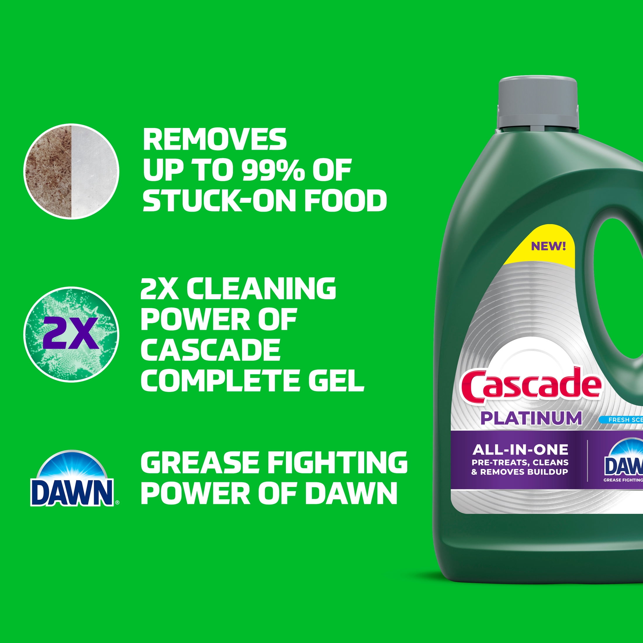 Cascade Platinum Gel dishwasher detergent removes up to 99% of stuck-on food for an all-in-one clean. That’s because Cascade Platinum Gel dishwasher detergent has 2X the Cleaning Power* of Cascade Complete gel, and it’s formulated with the grease-fighting power of Dawn dishwashing liquid. With the power to pre-treat, clean, and shine your dishes, the new formula is your all-in-one solution to stuck on food. Cascade Platinum Gel dishwasher detergent liquid is phosphate free. For best results, use Cascade Platinum Gel dishwasher detergent with Cascade Clean & Dry Booster Rinse Aid for powerful drying and a virtually spotless shine. Save up to 15 gallons of water per dishwasher load when you skip the pre-wash and run your dishwasher with Cascade Platinum Gel dishwasher detergent. Cascade Platinum Gel dishwasher detergent is also available in easy-to-use Action Packs (*on starch & protein soils vs. Cascade Complete Gel dishwasher detergent).