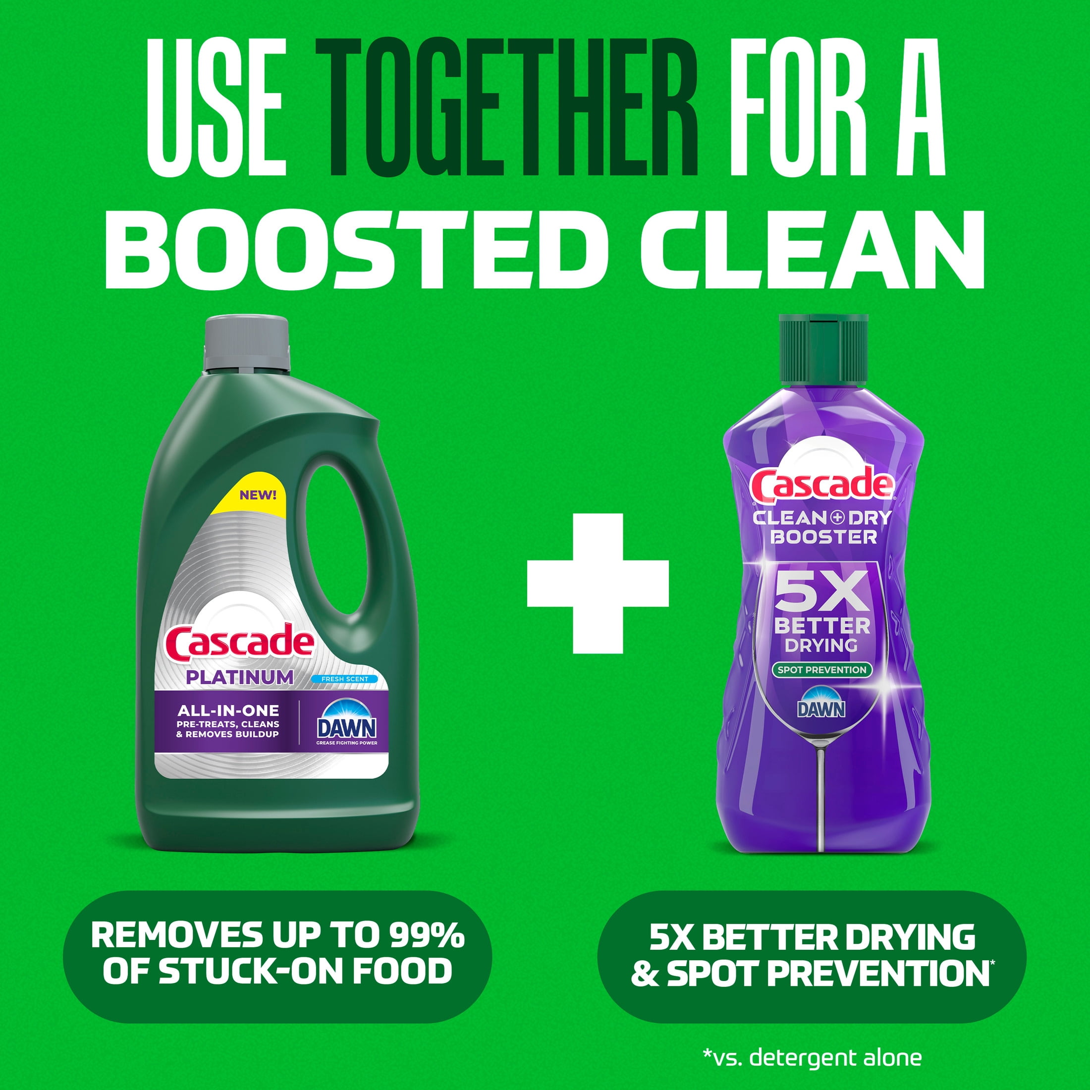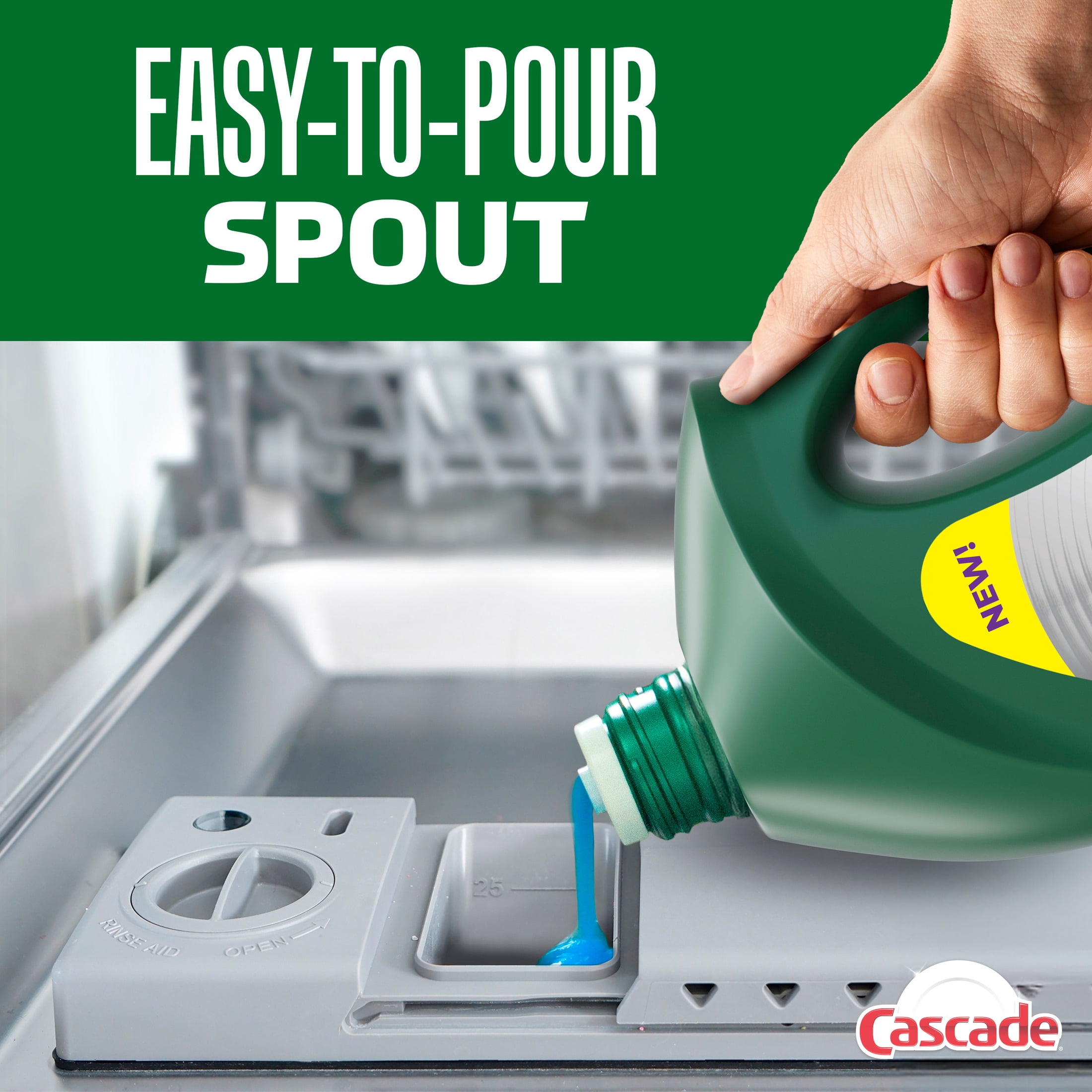 EASY TO USE: Dispense into your dishwasher with our easy to pour spout, and pre-treat directly onto stuck-on messes. Use with Cascade Clean & Dry Booster Rinse Aid for 5X drying and spot prevention and Cascade Platinum Dishwasher Cleaner.