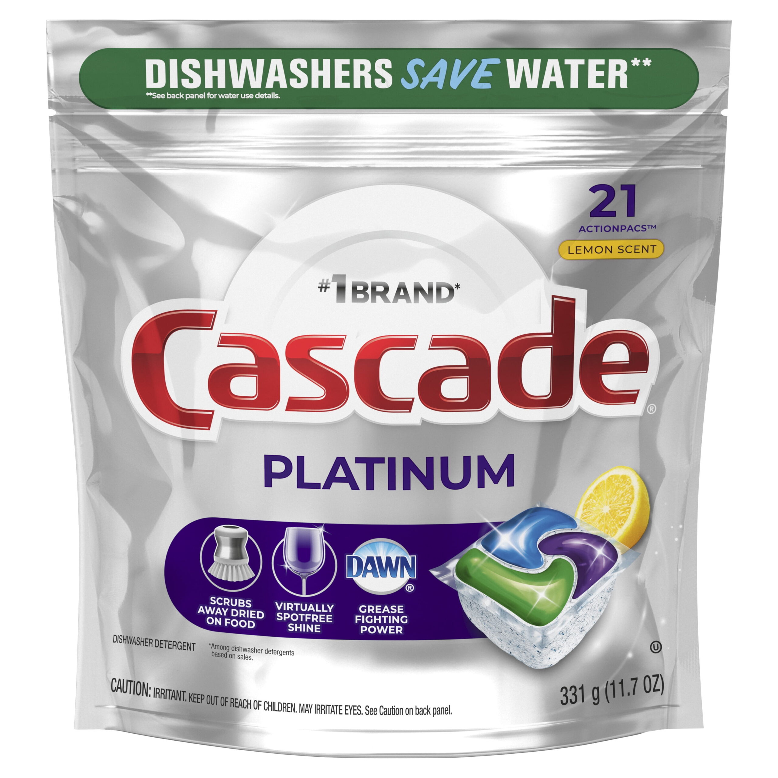 Cascade Platinum ActionPacs dishwasher detergent cleans burnt-on messes in just one wash, with no pre-wash needed. That’s because Platinum has 50% More Cleaning Power ( % cleaning ingredients vs. Cascade Complete ActionPacs) to tackle burnt-on foods. It dissolves fast to start cleaning right away, releasing the soaking power of Dawn dishwashing liquid, while food-seeking enzymes latch on and break down food into particles so small they can flow right down the drain. It’s so powerful it even works in the Quick Wash cycle. Plus, Cascade Platinum dishwashing detergent is formulated to help prevent hard-water filmingâkeeping your machine looking fresh and clean. Simply pop in an ActionPacs and reveal a Platinum sparkle.