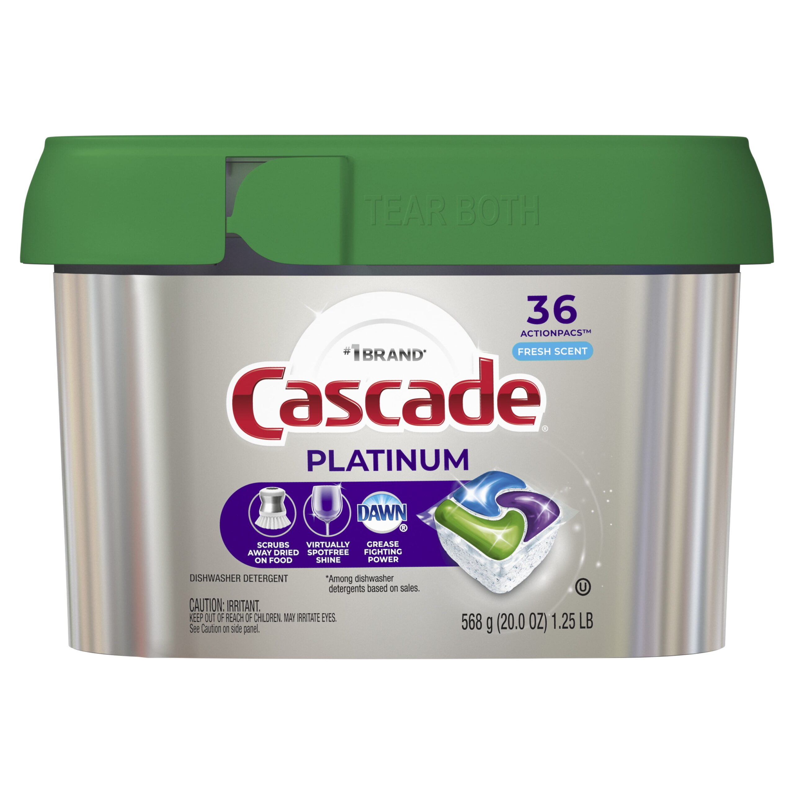 - Brand Name: Cascade Sub Brand: Platinum Scent: Fresh Product Form: Pods Product Type: Dishwasher Detergent Container Size: 36 pk Packaging Type: Boxed Cleans stuck on food in one wash *Dissolves fast *15X power *No pre-wash
