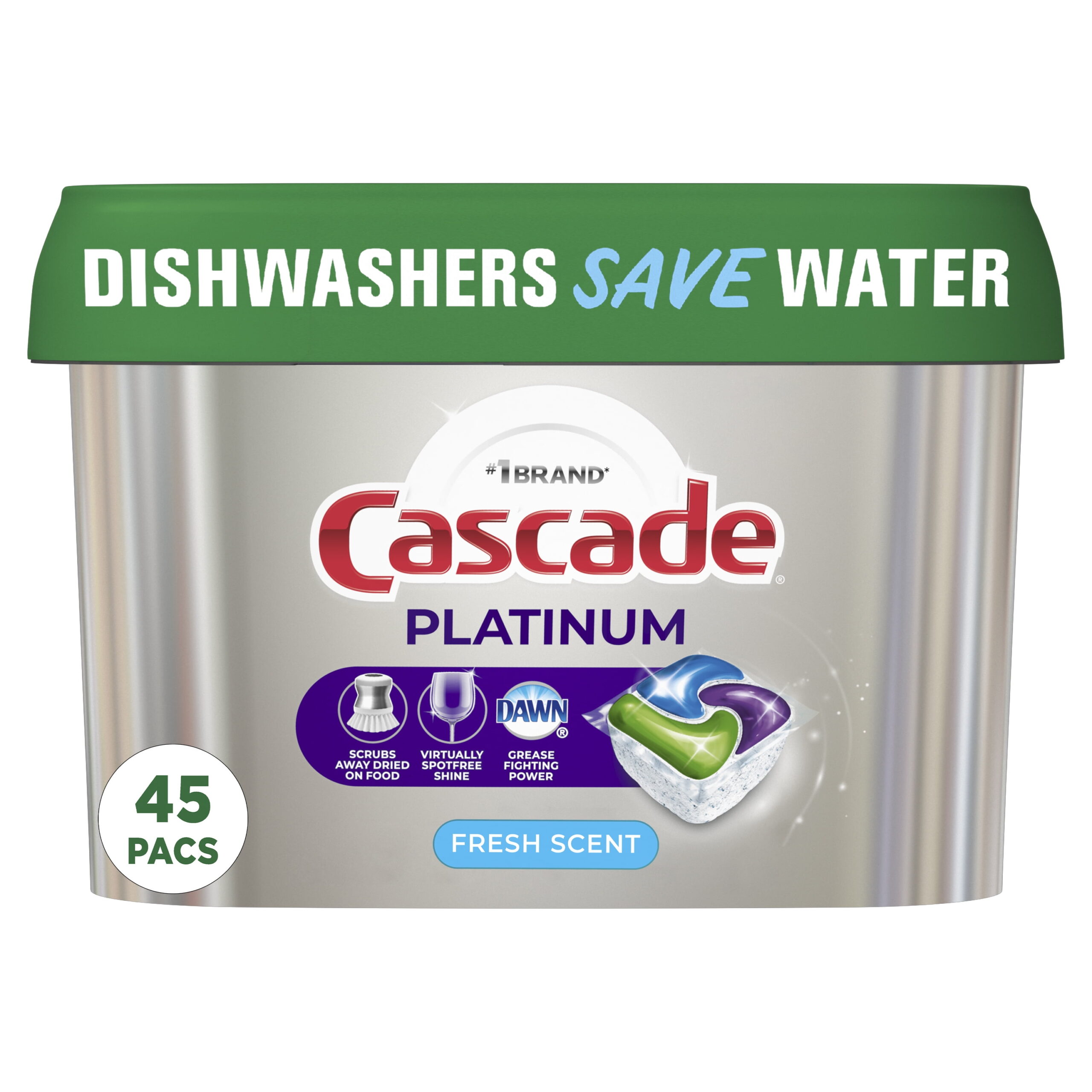 Cascade Platinum Action Pacs dishwasher detergent cleans burnt-on messes in just one wash, with no pre-wash needed. That’s because Platinum has 50% More Cleaning Power* (*% cleaning ingredients vs. Cascade Complete Action Packs) to tackle burnt-on foods. It dissolves fast to start cleaning right away, releasing the soaking power of Dawn dishwashing liquid, while food-seeking enzymes latch on and break down food into particles so small they can flow right down the drain. Plus, Cascade Platinum dishwashing detergent is formulated to help prevent hard-water filming-keeping your machine looking fresh and clean. 45 Count