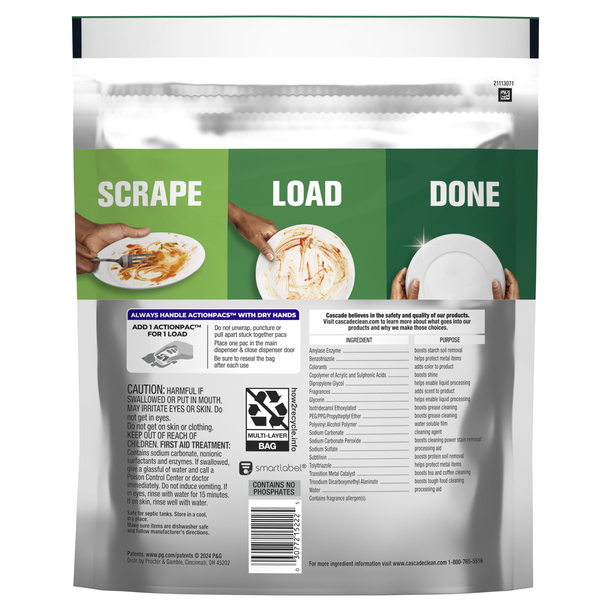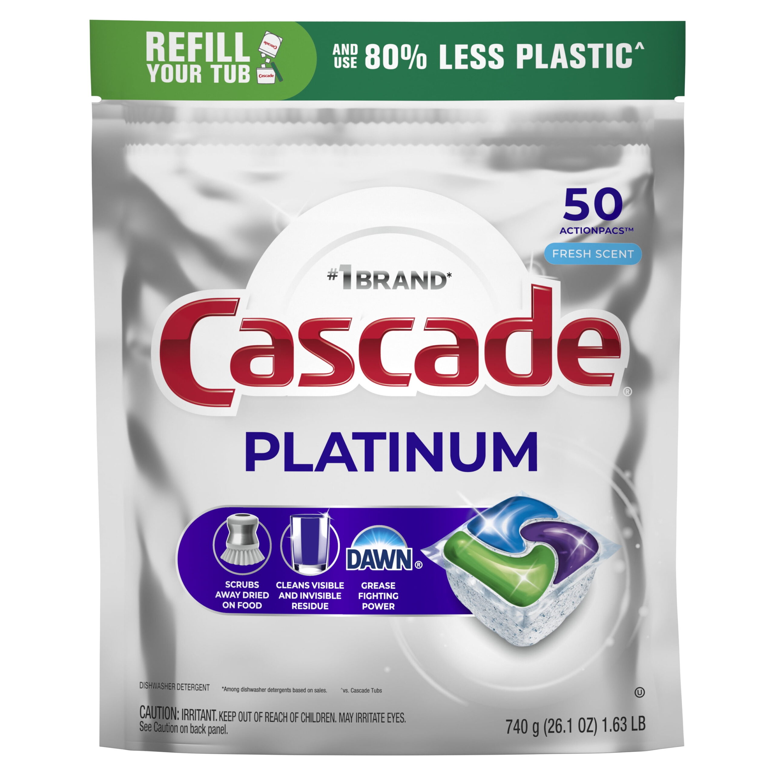 New and Improved Cascade Platinum ActionPacs dishwasher detergent scrubs away dried on food with no pre-washing required. That’s because the pod dissolves fast to start cleaning right away, releasing the soaking power of Dawn dishwashing liquid, while food-seeking enzymes latch on and break down food into particles so small they can flow right down the drain. Cascade Platinum dishwashing detergent is formulated to remove visible and invisible residue for gleaming glassware and dazzling dishes. Save up to 20 gallons of water per dishwasher load when you skip the pre-wash and run your dishwasher with Cascade Platinum