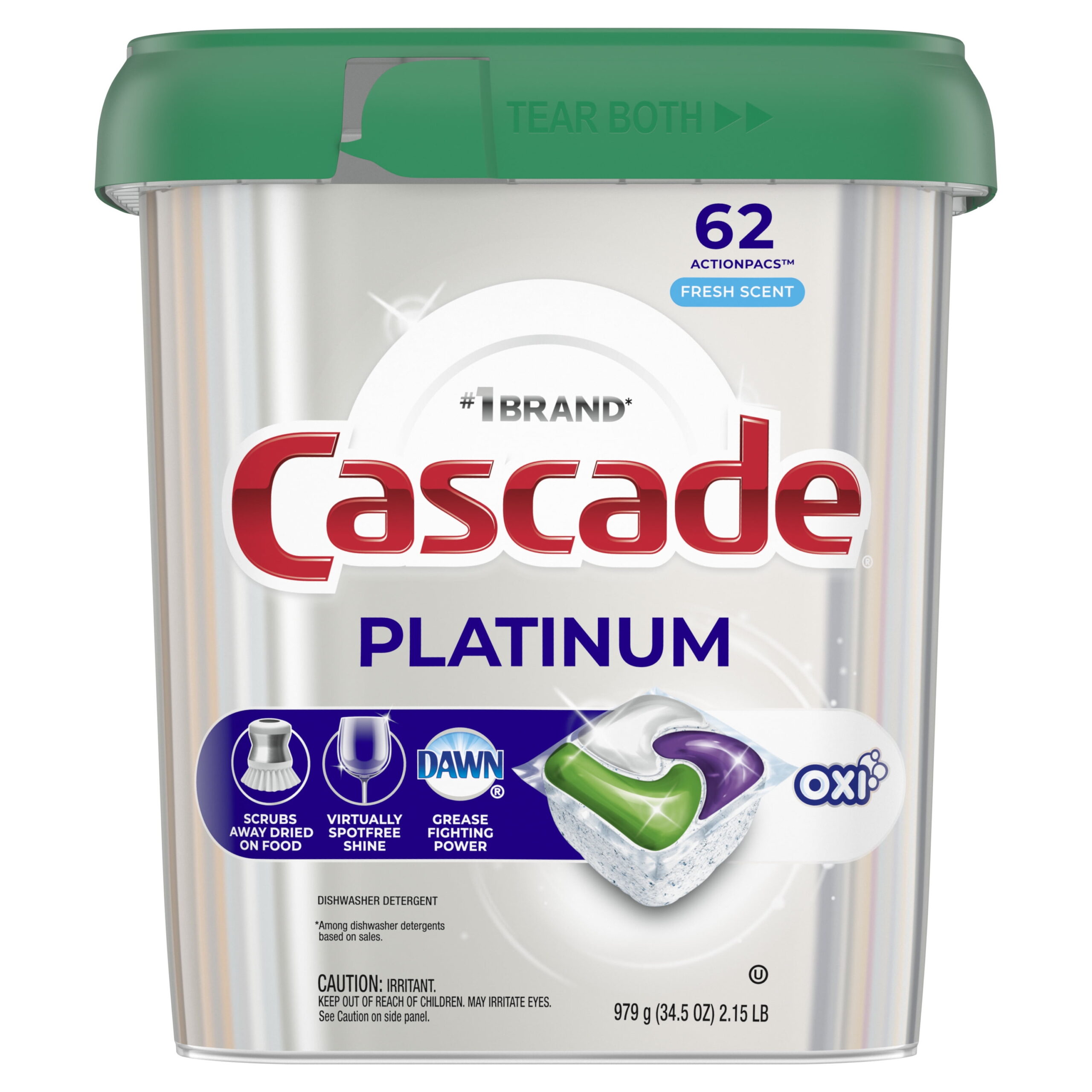 Cascade Platinum ActionPacs dishwasher pods effectively cleans burnt-on messes in just one wash, eliminating the need for any pre-wash. This remarkable product features 50% more cleaning power* (*% cleaning ingredients vs. Cascade Complete ActionPacs) to tackle even the toughest burnt-on foods. The dishwasher pods dissolve quickly to initiate cleaning immediately, releasing the soaking power of Dawn dishwashing liquid. Meanwhile, food-seeking enzymes in these dishwasher pods latch onto and break down food into particles so small that they can flow effortlessly down the drain. These powerful dishwasher pods are so effective that they even work wonders in the Quick Wash cycle. Additionally, Cascade Platinum dishwasher detergent tabs are specifically formulated to help prevent hard-water filming, ensuring that your machine remains looking fresh and clean. To enjoy a Platinum sparkle, simply pop in an ActionPac and run your dishwasher. By skipping the pre-wash with Cascade dishwasher tabs and utilizing these innovative dishwasher pods, you can save up to 15 gallons of water per load. With the distinction of being the #1 recommended brand in North America* (*More dishwasher brands in North America recommend Cascade vs. any other automatic dishwashing detergent brand, recommendations as part of co-marketing agreements), each 62 Count package of these fresh-scented dishwasher pods delivers exceptional cleaning power and convenience for your dishwashing needs.