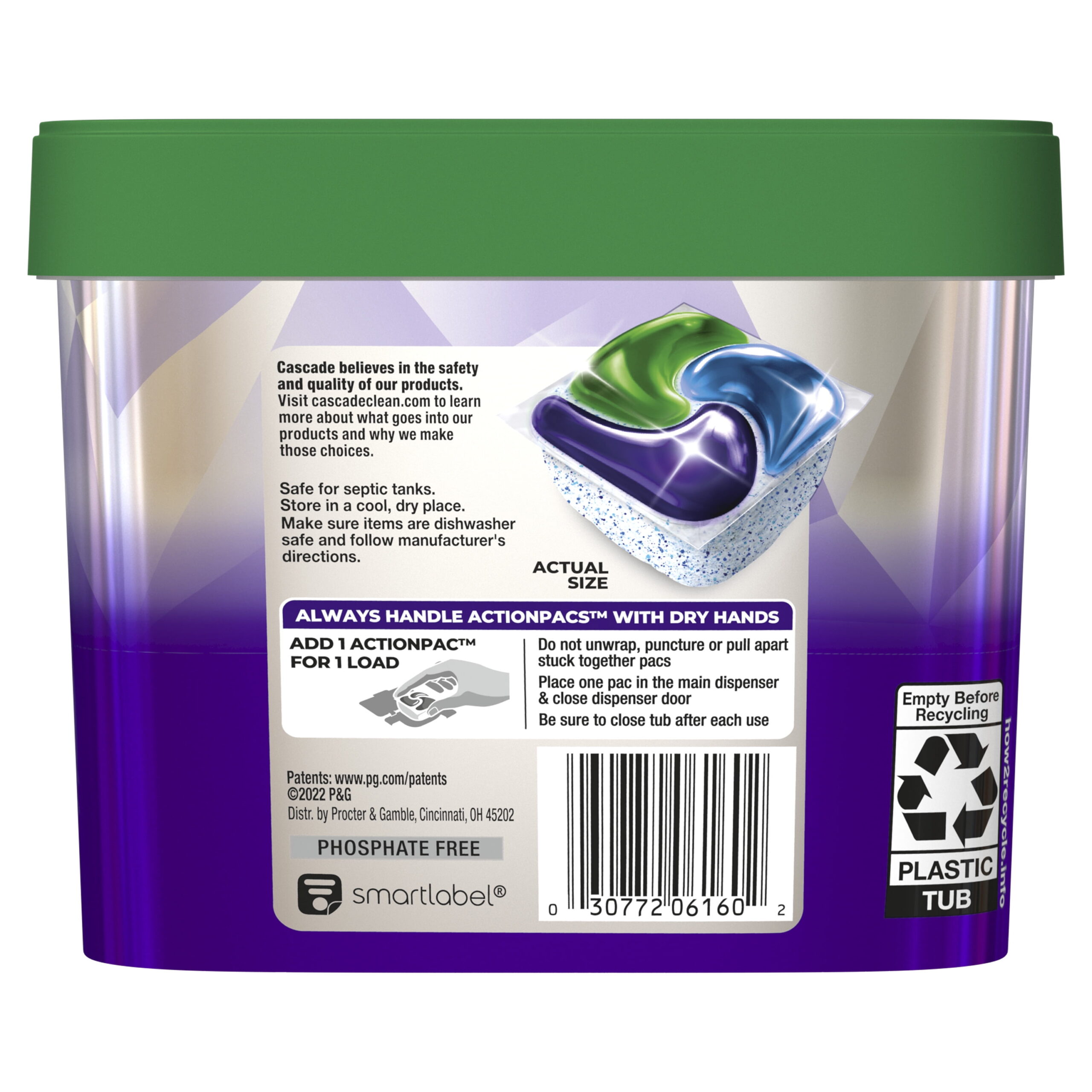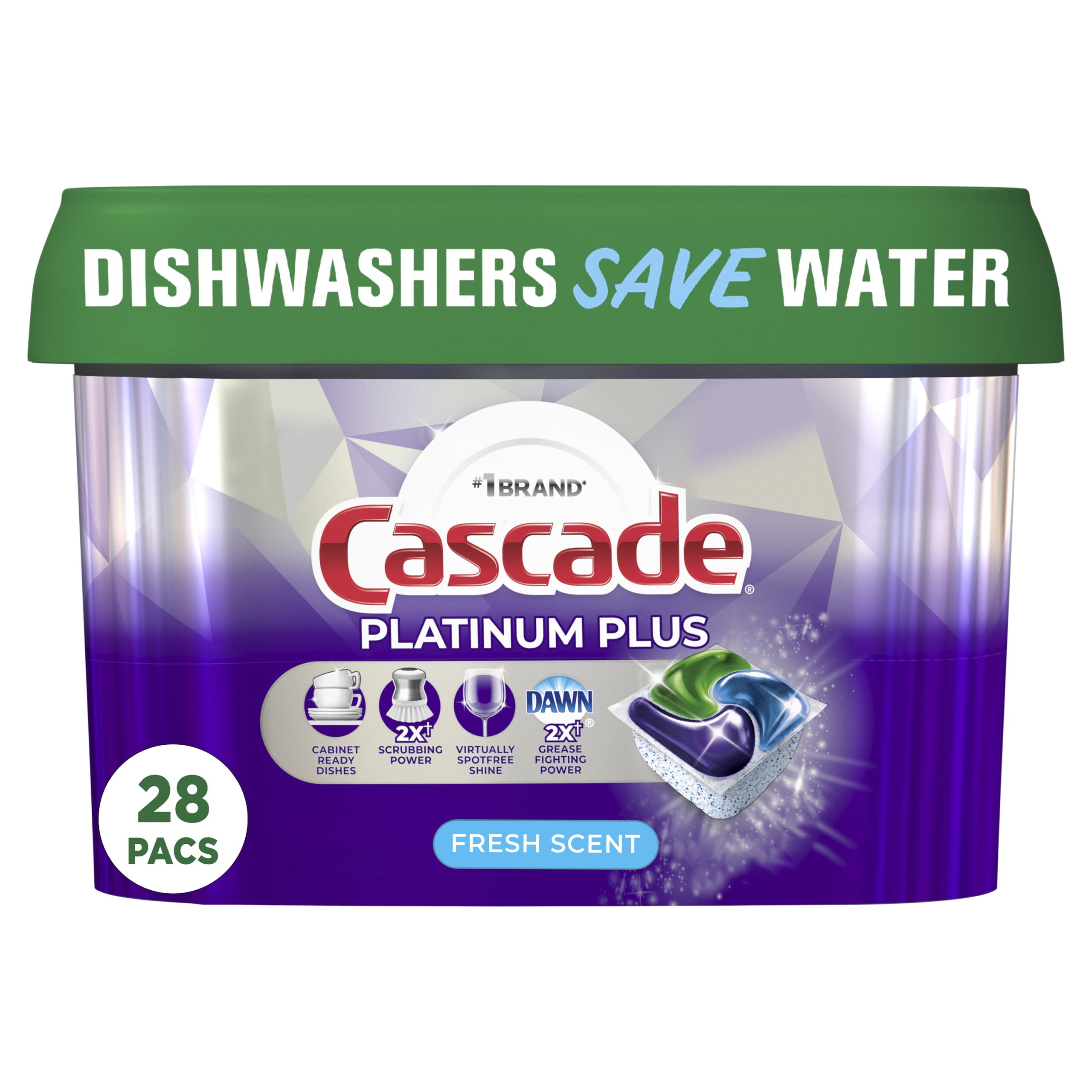 Cascade Platinum Plus ActionPacs dishwasher pods delivers a revolutionary, cabinet-ready clean for your dishes. Infused with 2X* the grease-fighting power of Dawn and equipped with 2X* the robust food scrubbers, these dishwasher pods incorporate soaking, scrubbing, and rinsing capabilities all in one convenient package of dishwashing detergent tabs. You can confidently skip the pre-rinse, avoid the soak, and eliminate the need for scrubbing—dare to dish differently with Cascade dishwasher detergent! Simply scrape your dishes and load them into your dishwasher with these powerful dishwasher pods to achieve a superior, sparkling clean that saves you time, effort, and energy compared to traditional handwashing. Experience virtually spot-free, gleaming glassware, dazzling dishes, and pristine pots and pans with Cascade Platinum Plus dishwasher detergent pods. *Cleaning ingredients vs. Cascade Complete ActionPacs detergent. Enjoy the refreshing Fresh Scent in this 28 Count package of dishwasher detergent tabs, designed to transform your dishwashing routine into a hassle-free experience.