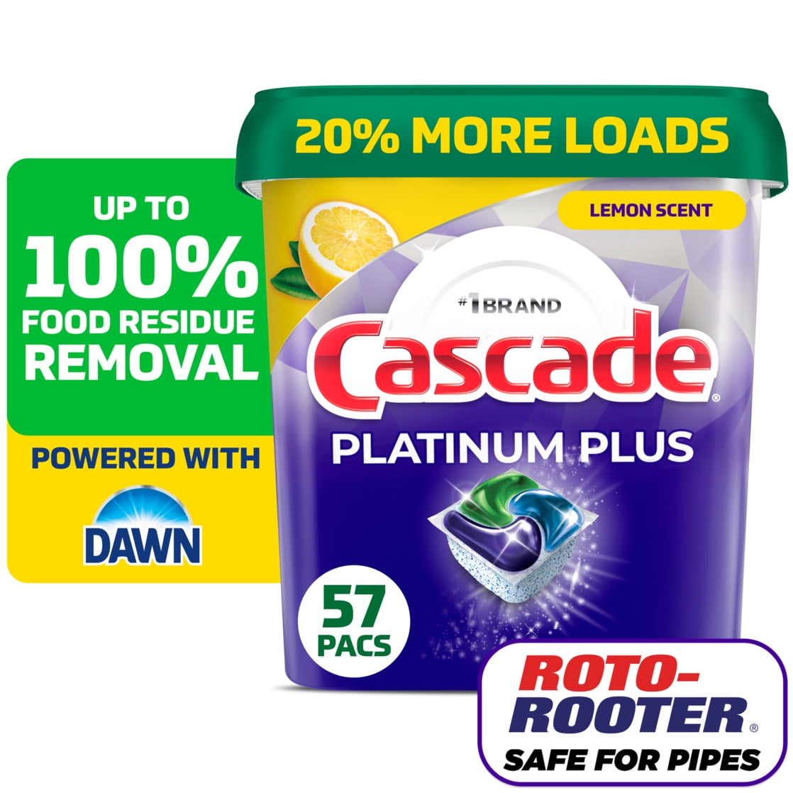 New and Improved Cascade Platinum Plus ActionPacs dishwasher detergent gives your dishes a breakthrough clean with up to 100% food residue removal. Loaded with 2X* the Dawn grease fighting power, and 2X* the tough food scrubbers, it has soaking, scrubbing, and rinsing built right in. You can skip the pre-rinse, skip the soak, skip the scrub, and dare to dish differently. Just scrape your dishes and load them into your dishwasher with Platinum Plus to get a superior, sparkling clean, saving you time, effort, and energy vs handwashing. Cascade Platinum Plus removes visible and invisible residue for gleaming glassware, dazzling dishes, and pristine pots and pans. *Cleaning ingredients vs. Cascade Complete ActionPacs.