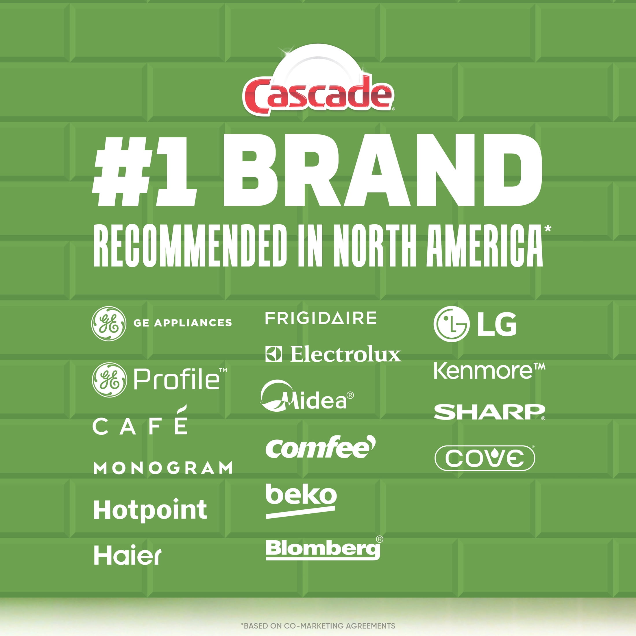 • #1 Recommended Brand in North America* *More dishwasher brands in North America recommend Cascade based on co-marketing agreements vs. other automatic dishwasher detergent brands