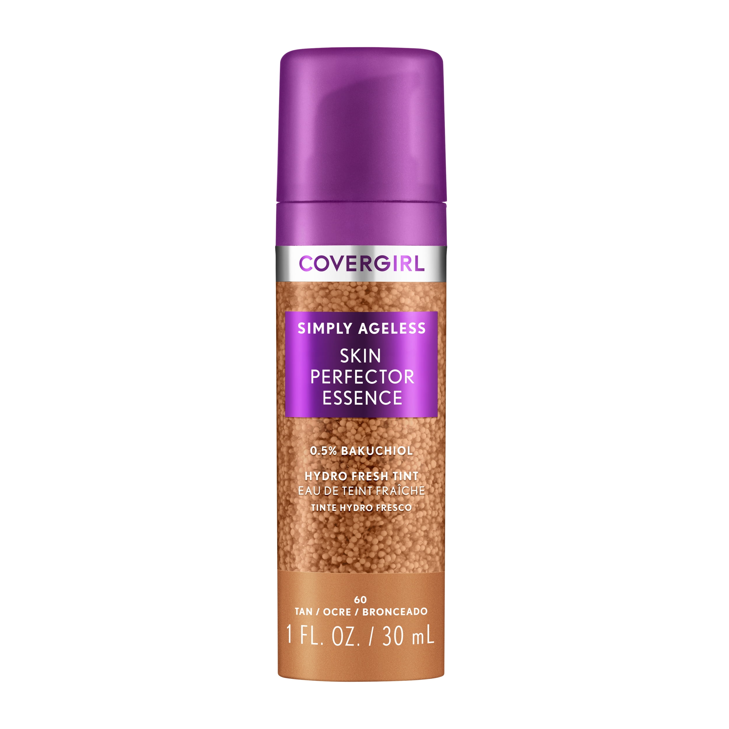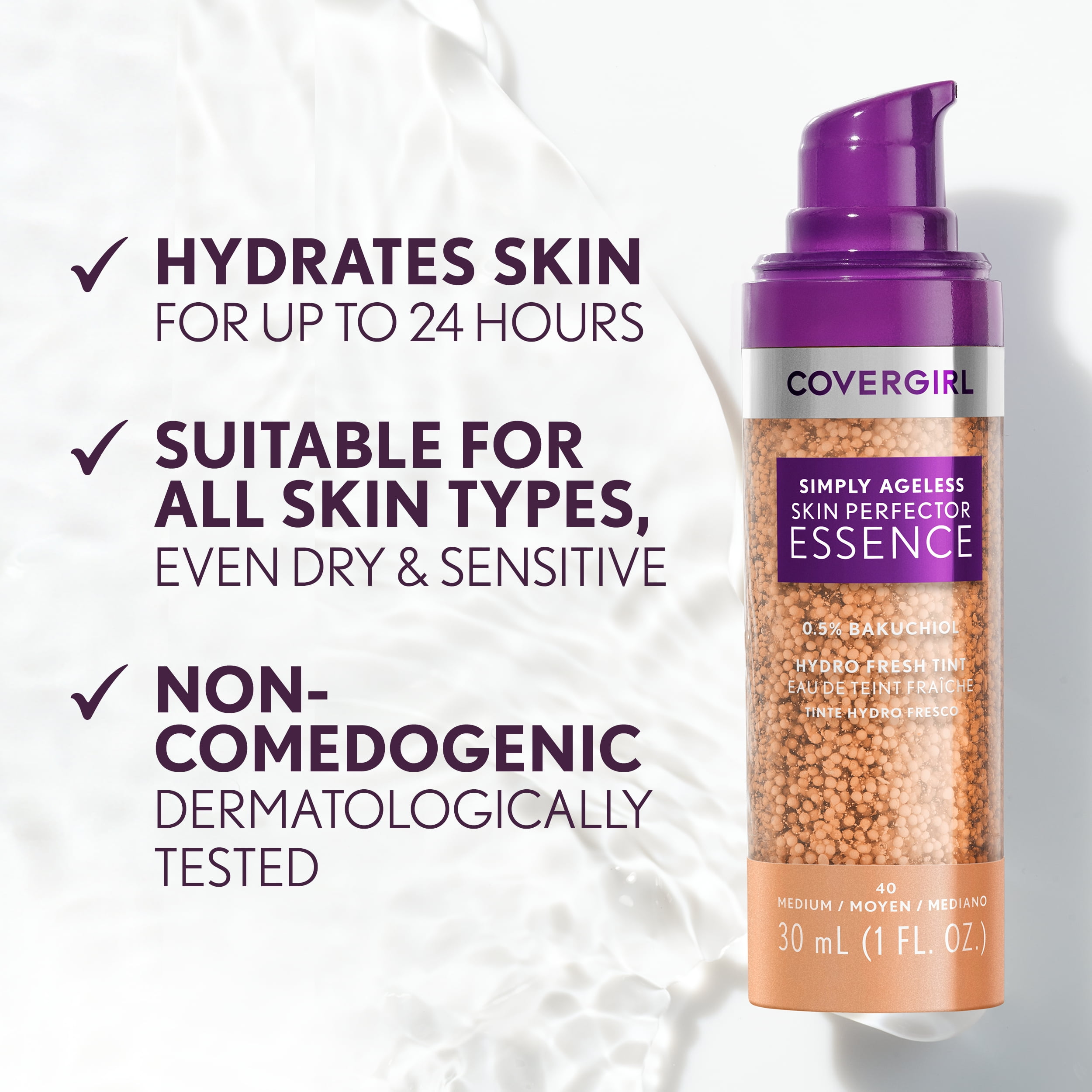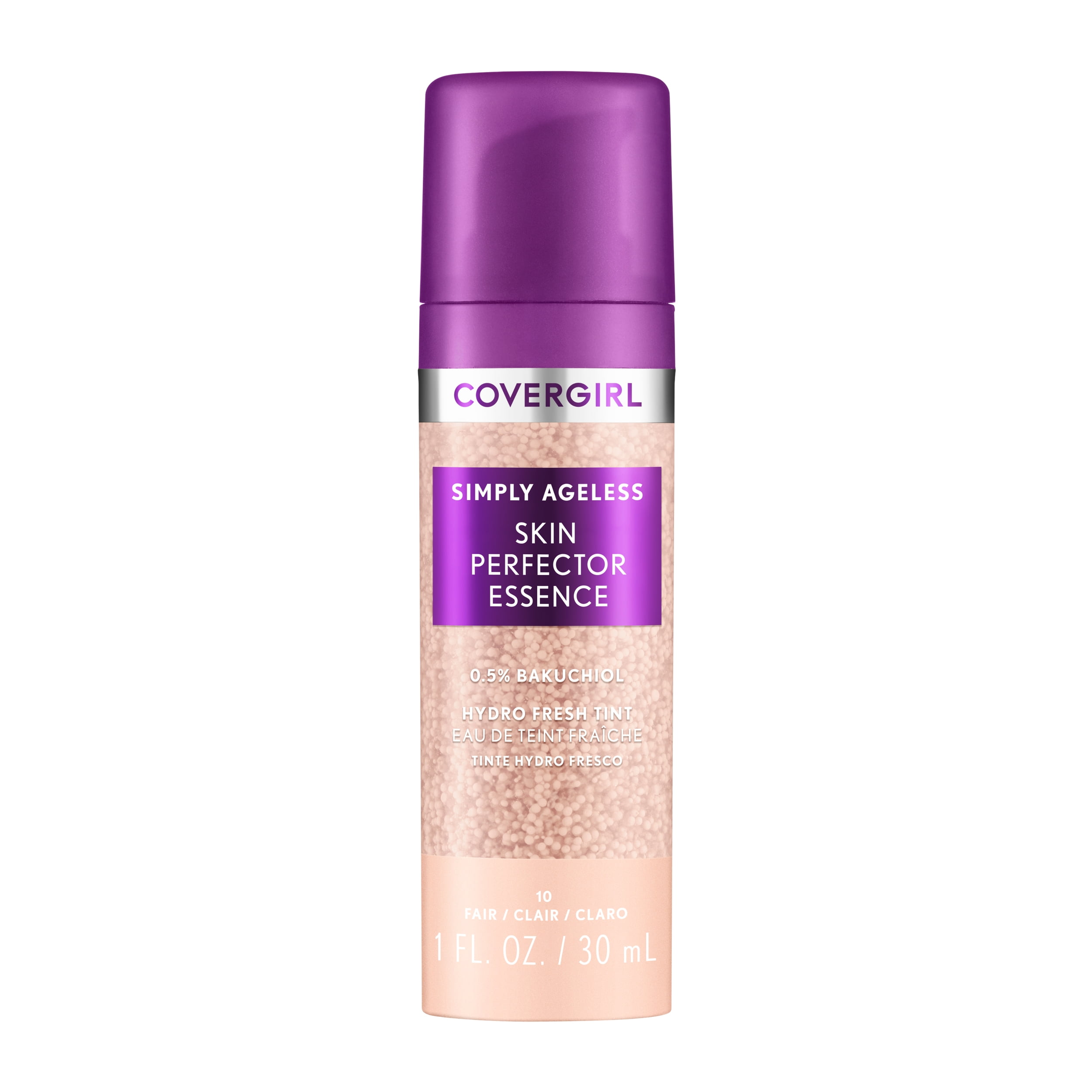 COVERGIRL Simply Ageless Skin Perfector Essence Foundation. Skincare + Makeup Hybrid with Microdroplet Technology. Pigmented capsules blend easily to distribute an even tint. Hydrates skin for up to 24 hours. Complexion looks more even – instantly and over time. Suitable for all skin types, even dry & sensitive. Leaping Bunny Approved by Cruelty-Free International (CFI). Available in 8 fexible shades.