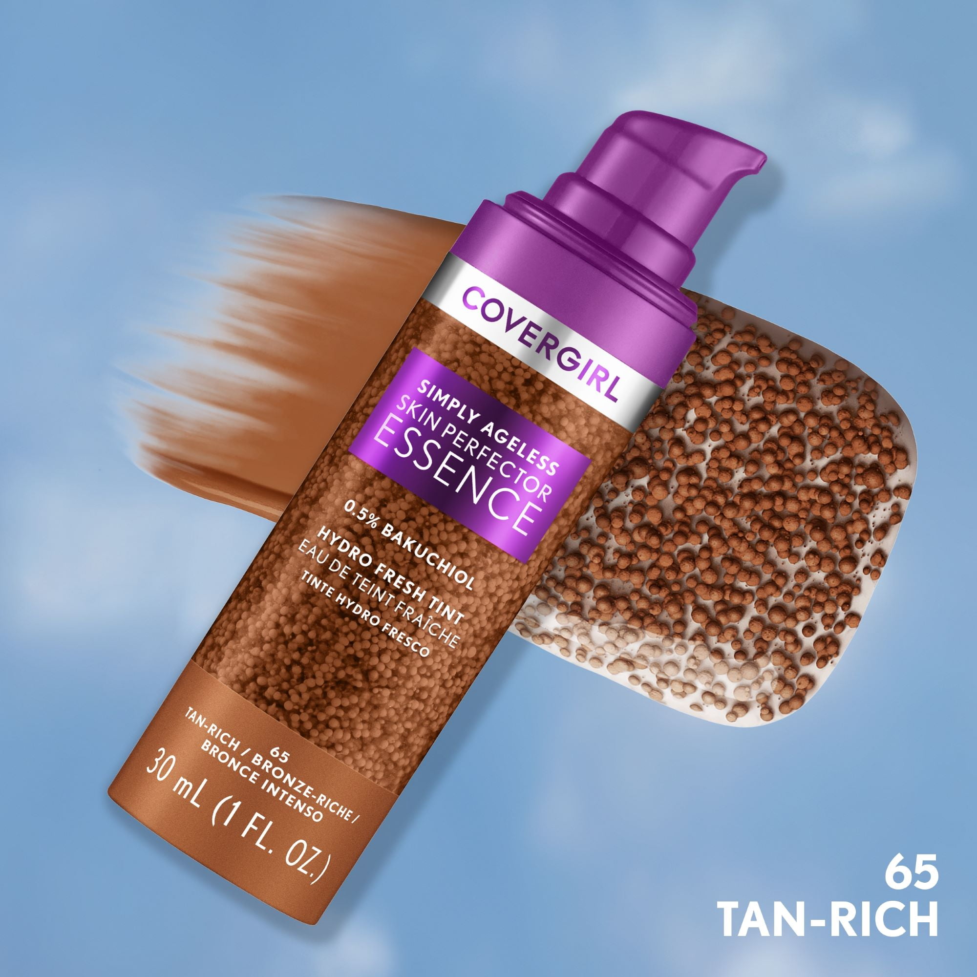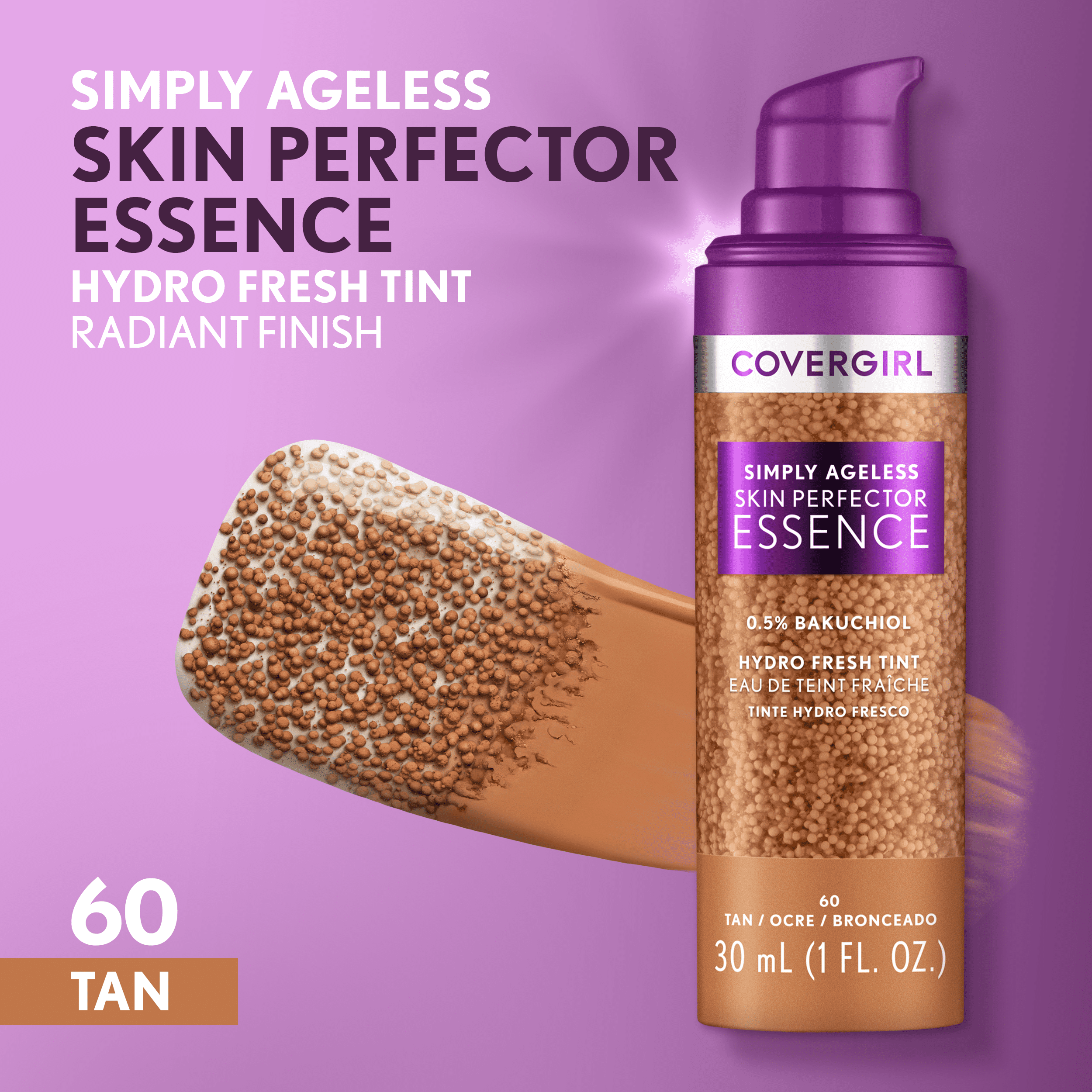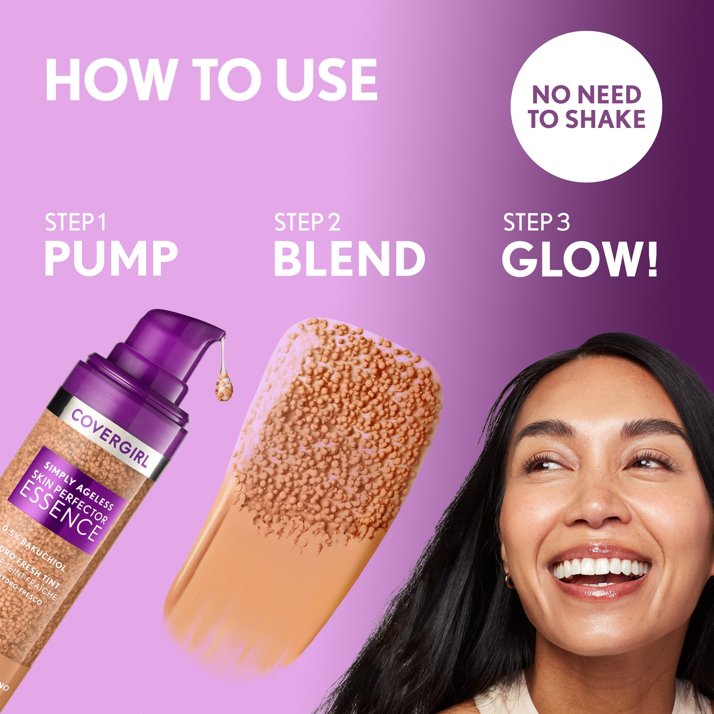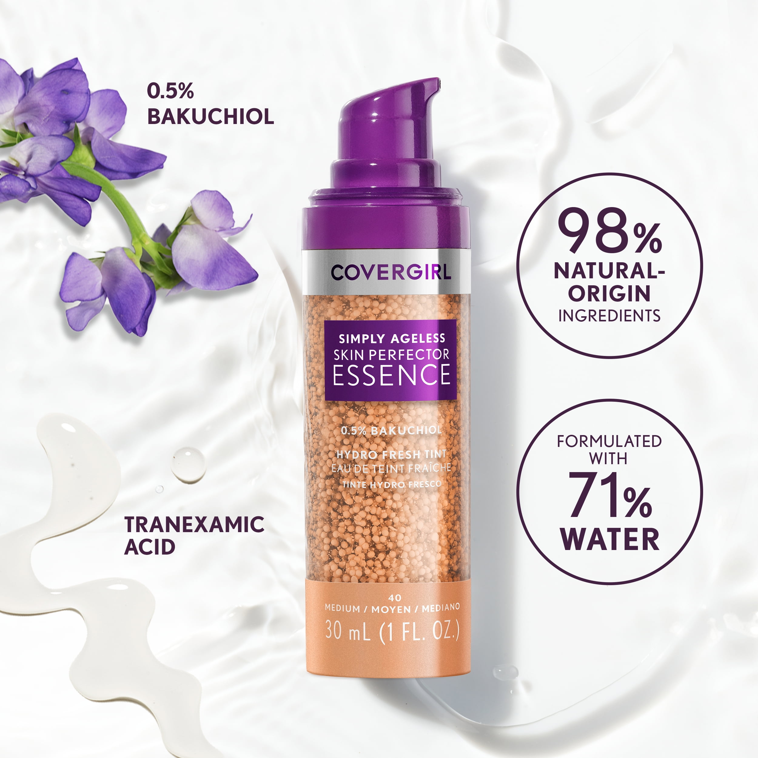 COVERGIRL Simply Ageless Skin Perfector Essence Foundation. Skincare + Makeup Hybrid with Microdroplet Technology. Pigmented capsules blend easily to distribute an even tint. Hydrates skin for up to 24 hours. Complexion looks more even – instantly and over time. Suitable for all skin types, even dry & sensitive. Leaping Bunny Approved by Cruelty-Free International (CFI). Available in 8 fexible shades.