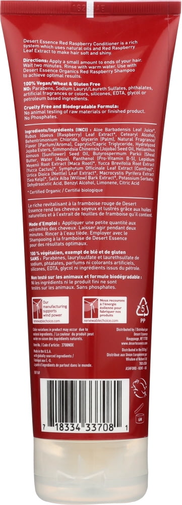 Desert Essence Red Raspberry Conditioner enhances your hair’s shine. It’s a rich system that uses natural oils and red raspberry fruit extract to make hair soft and shiny. Treat your hair to natural vitamin A, vitamin C, calcium and magnesium found in the organic red raspberry fruit extract, which strengthens hair and imparts a natural shine. The nutrients found in organic jojoba and sunflower oils are also necessary for healthy shiny hair. This 100% vegan, wheat and gluten-free conditioner is good for your hair and good for the environment with no parabens, sodium lauryl/laureth sulfates, artificial fragrances or colors, silicones, EDTA, glycol, or petroleum based ingredients.