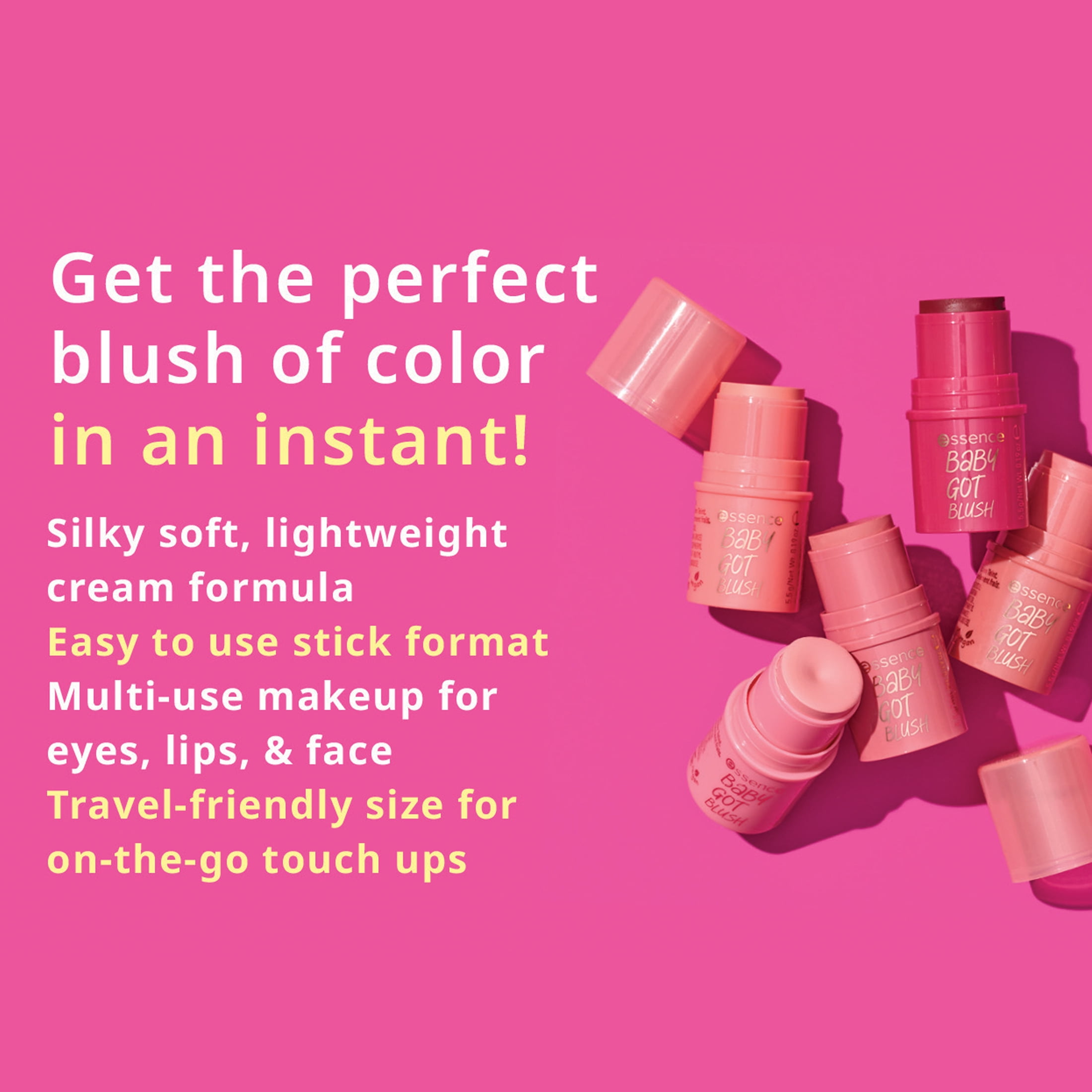 Blush your cheeks with the perfect touch of color in an instant! essence Baby Got Blush is a cream blush stick that applies and blends easily for a boost of color to brighten your cheekbones and give you a fresh, more blushed look! These cuties melt into the skin and are perfect for travel or to keep in your purse for on-the-go touch ups!