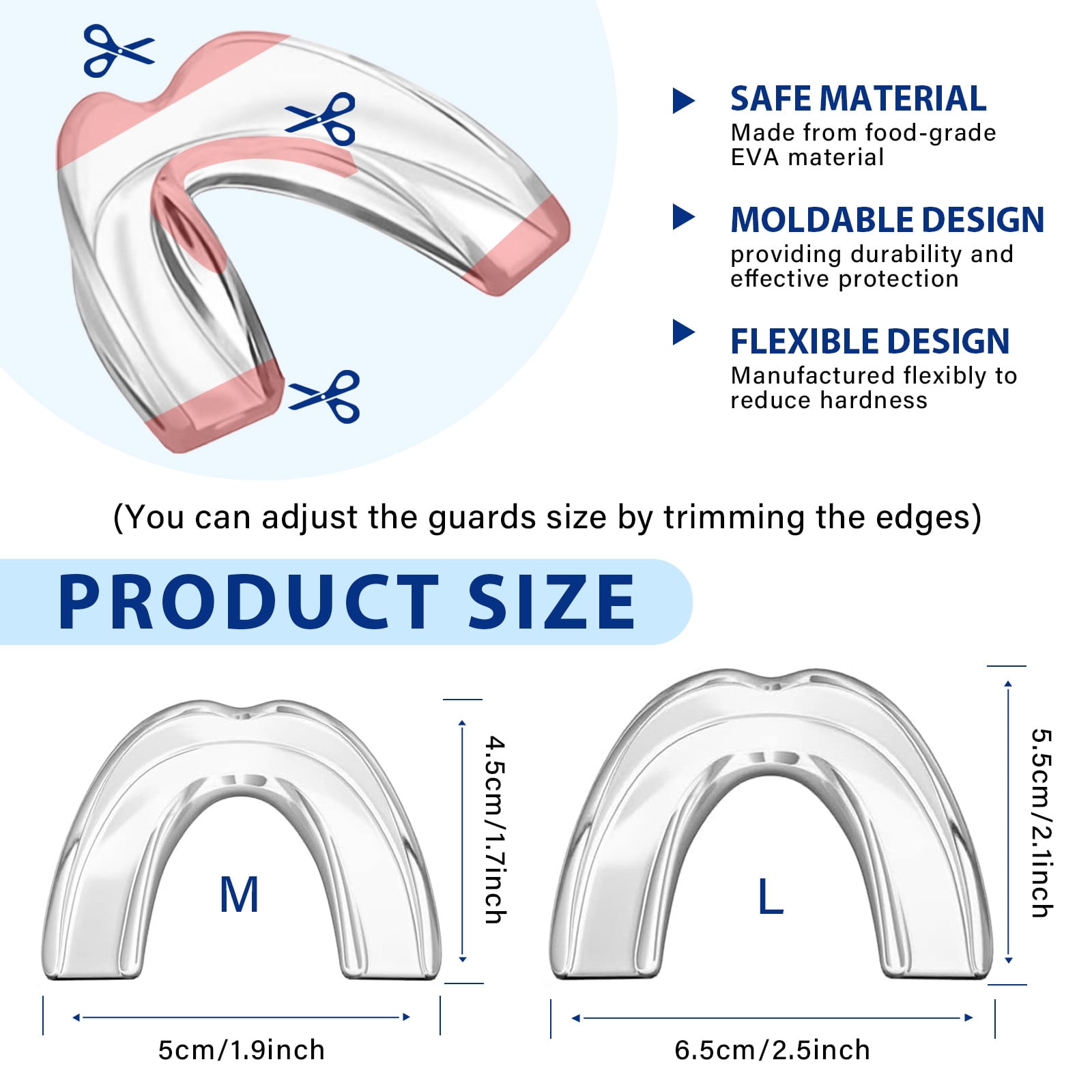 - CUSTOMIZABLE FIT, MOLDABLE MOUTH GUARD FOR SLEEPING: The mouth guard for clenching teeth at night is designed to fit mouths of all sizes. This package consists of four mouth guards, featuring two different sizes with superior quality and design. Our mouthguards for grinding of teeth is made of a moldable material, which needs to go through the molding process before use, and you can trim this sleep mouth guard as you need.