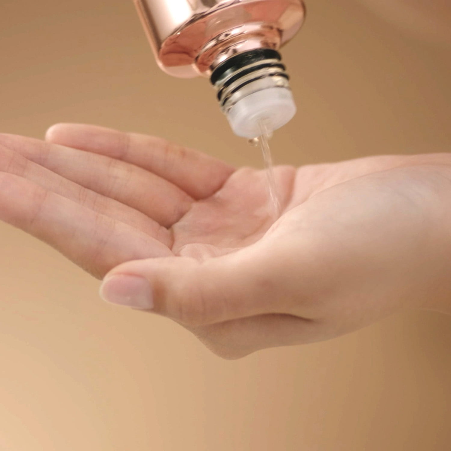 1.Pour LXP Ultimate Revival Essence onto a cotton pad or into the palm of the hand, about 5-10 splashes, enough to soak the cotton pad or palm completely.